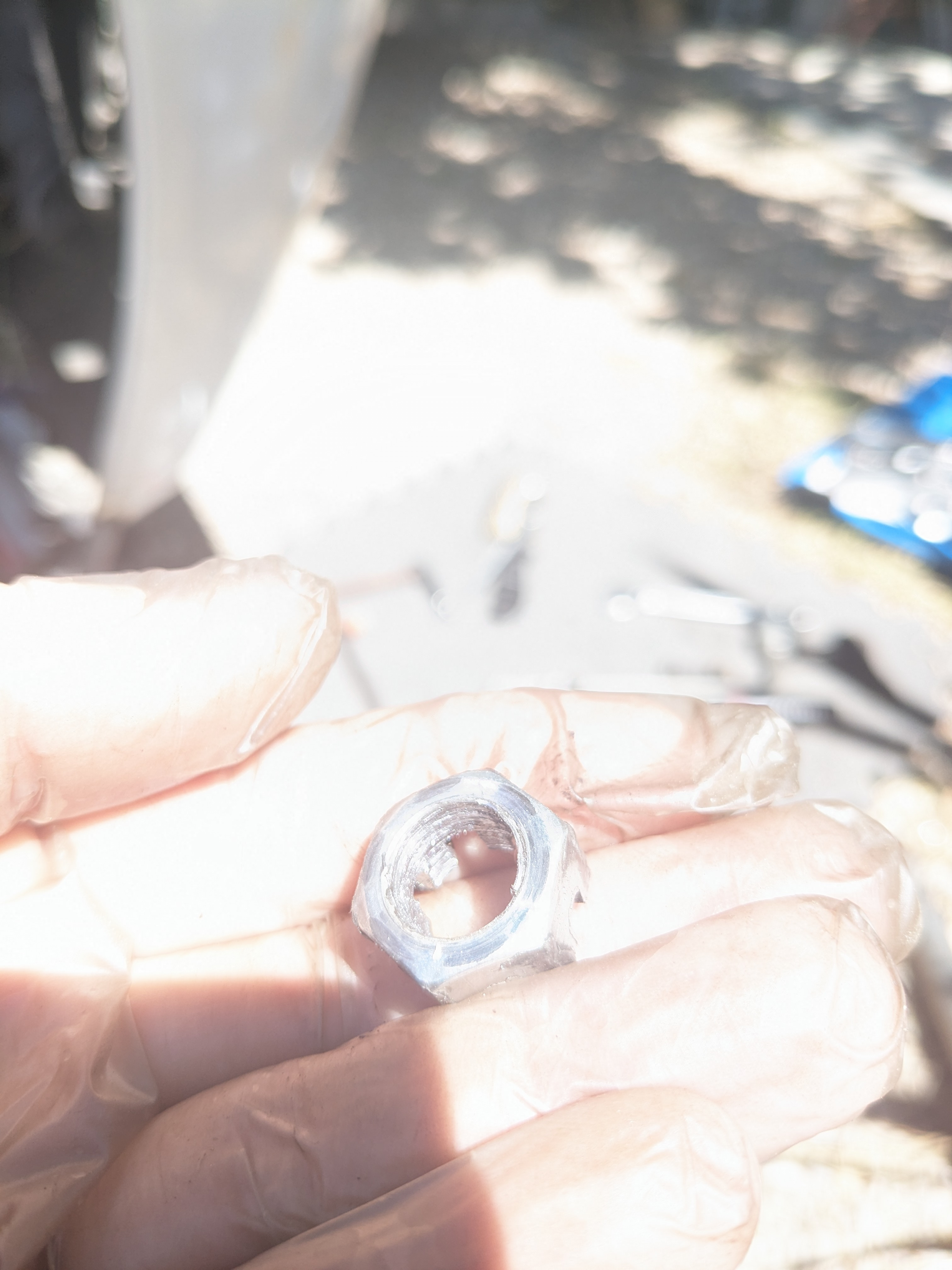 J'ai du mal à comprendre comment on peut abimer le filetage si haut. Si tu visses l'écrou en biais, le résultat se fais sentir au bout d'un demi-tour. Là le filet à disparu au bout de 5 tours !