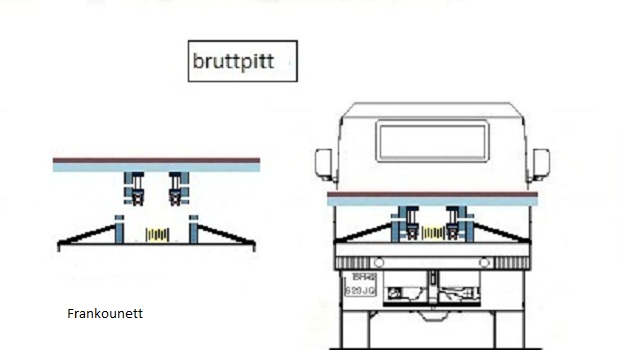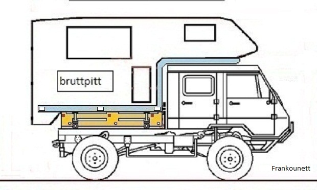 Les 4 petits carrés au centre c'est mes petits crics bouteilles montés sur roulettes et à l'avant du cadre (à droite si vous préférez) c'est deux tubes coulissants qui vont s'insérer dans les trous qu'on a prévu dans la partie verticale à l'avant du plancher du Zipou.