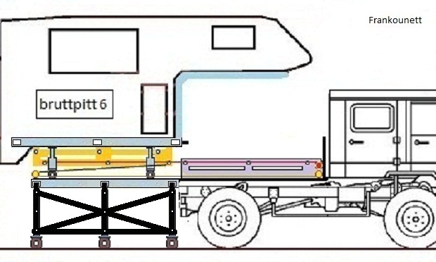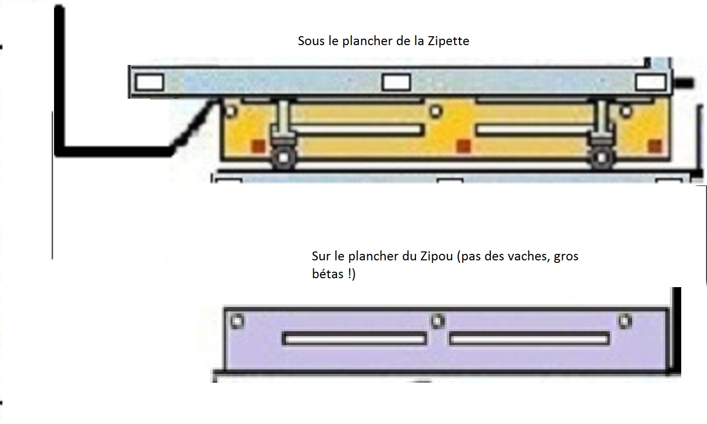 Vous remarquez bien sur que les pièces fixées au sous plancher de la Zipette sont prévues pour circuler à l'intérieur de celles côté Zipou et ceci par l'habile truchement de roulettes montées sur crics bouteilles venant rouler sur des rails fixés sur le plancher Zipou. au fond on voit un petit treuil de 4x4 dont nous reparlerons.