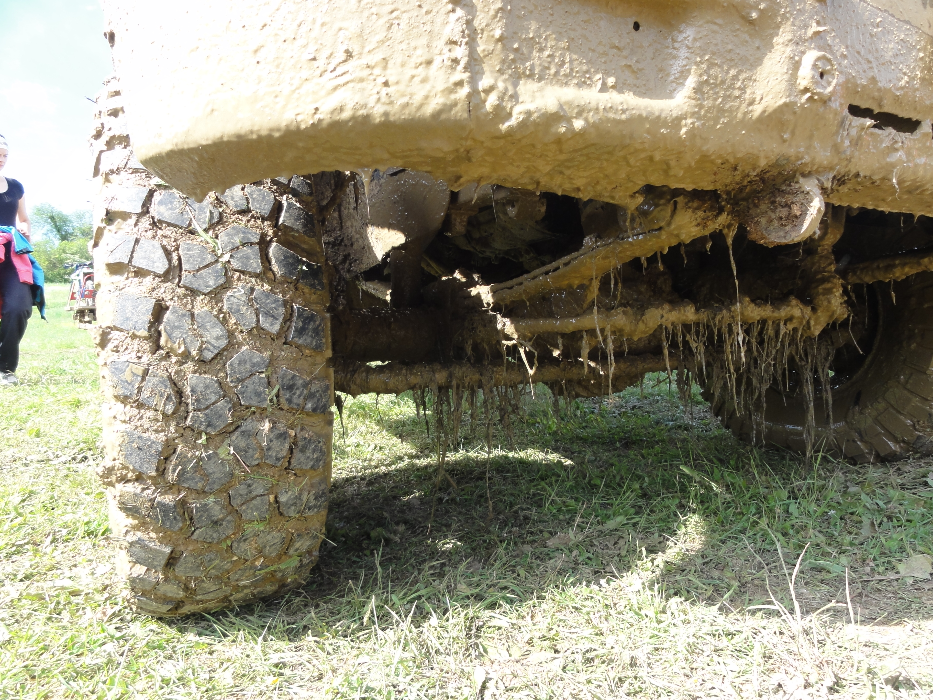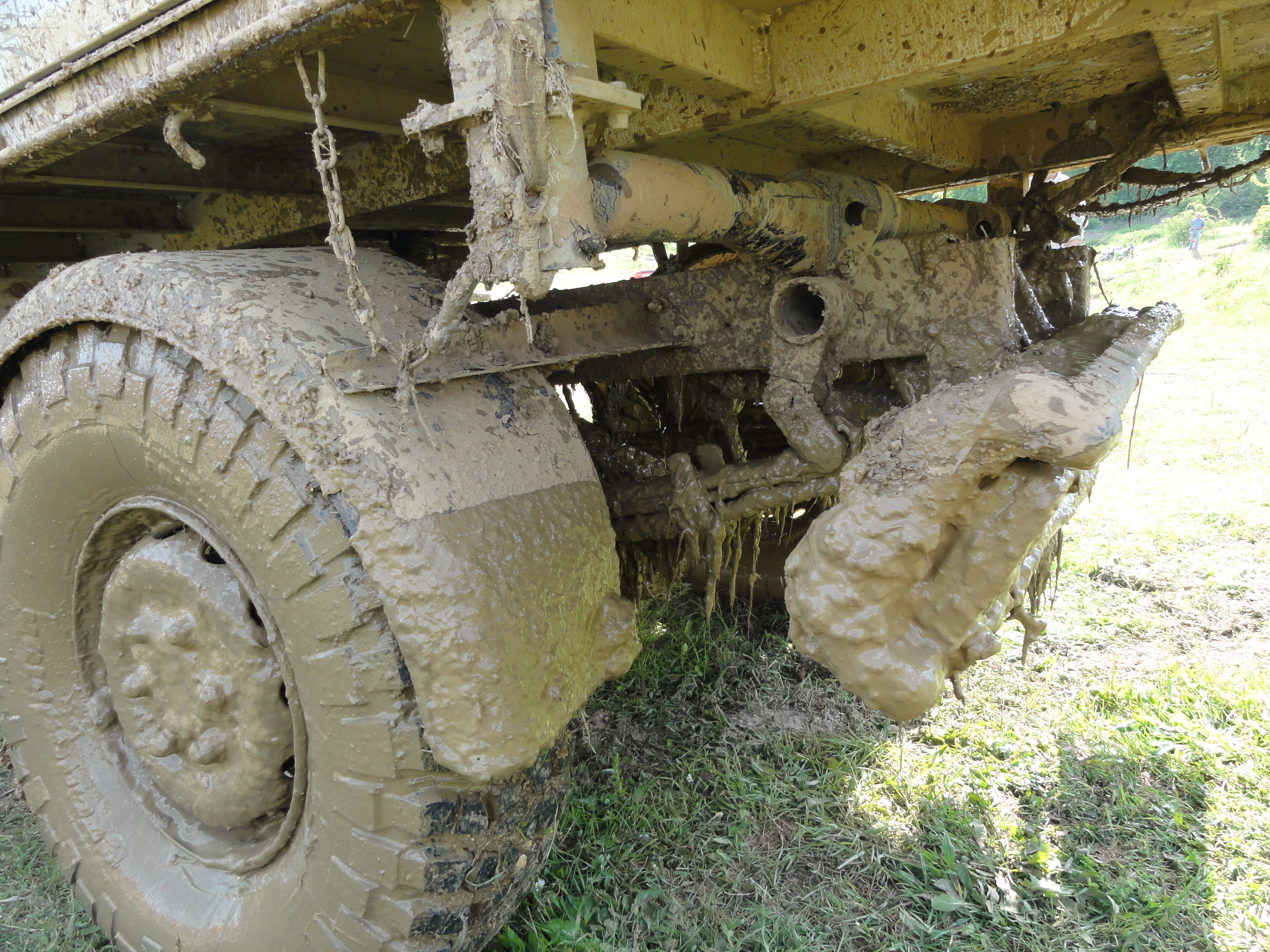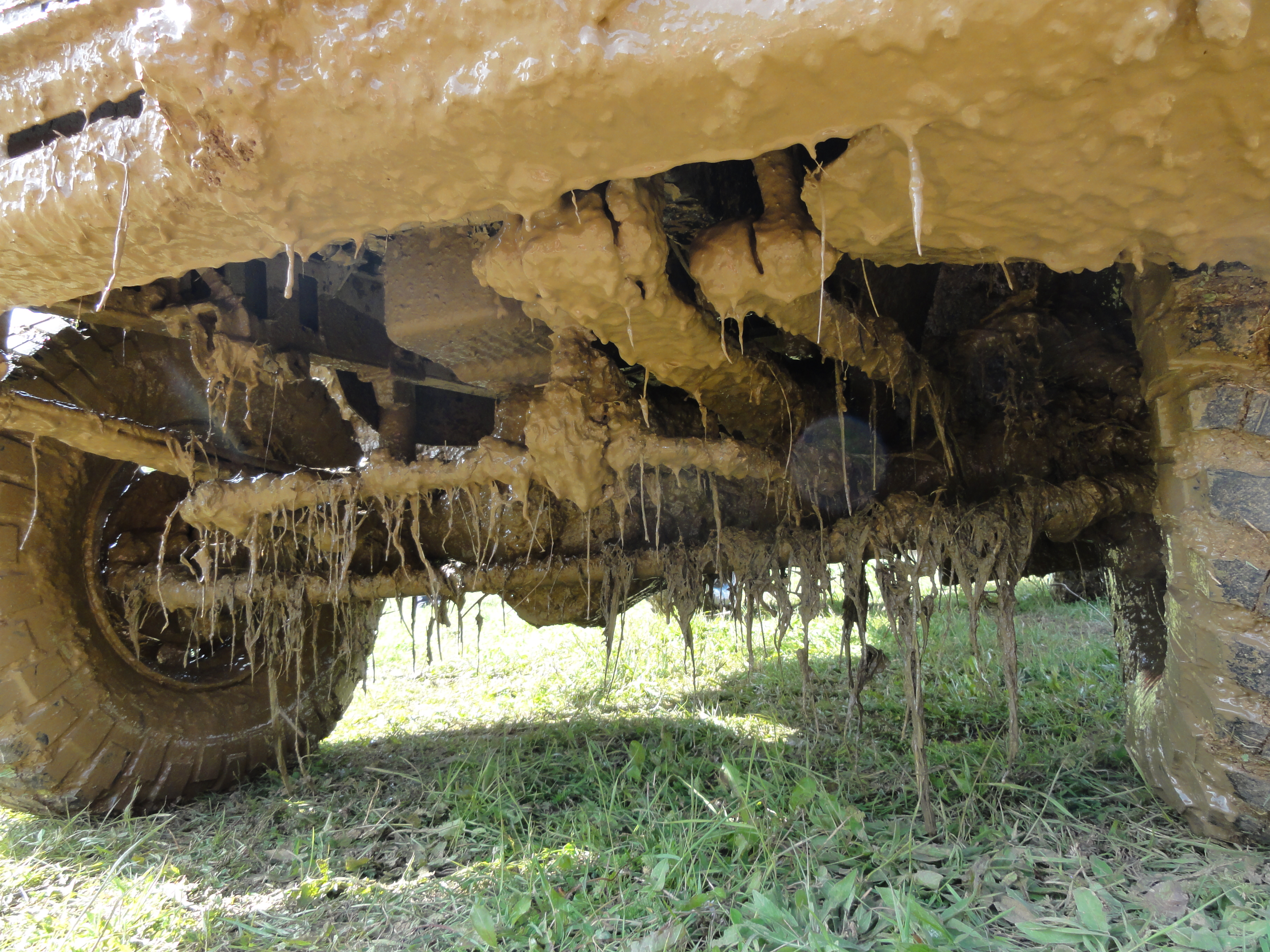 Arrêt derrière la rambarde de sécurité, démontage des roues avant et oh surprise ! de la boue !!