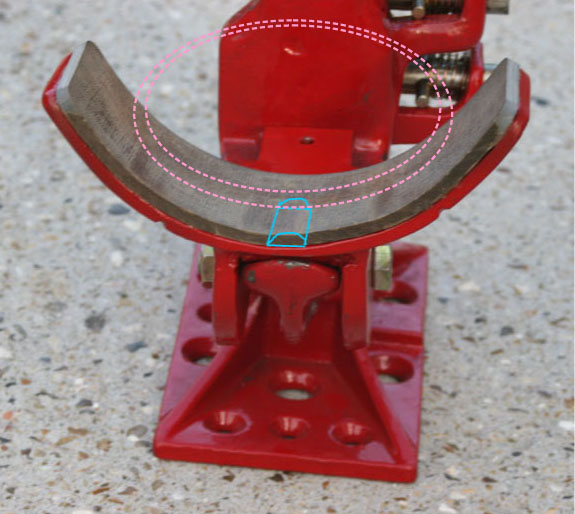 - ne pas coller de caoutchouc sur le berceau mais souder un demi-cylindre de diamètre adapté (en bleu sur le crayonnage ci-dessous) pour se loger dans une des cannelures extérieures, entre les logements des goujons du moyeu. Ce demi-cylindre viendrait en butée contre la flasque extérieure du moyeu (pointillés roses) et la tête du Hilift ne pourrait plus sortir.