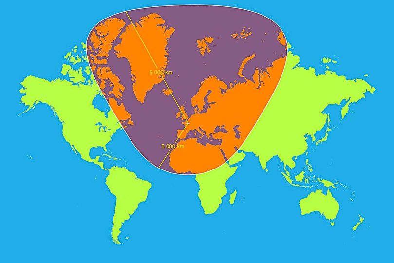 on le sait tous qu'un planisphere est une vision déformée du monde mais c'est toujours drôle de le voir clairement comme ici un cercle (ou plutôt disque) de 5000km de rayon en partant de Paris vous permet d'atteindre ceci: (a vol d'oiseau naturellement)
