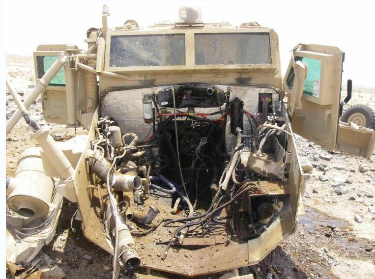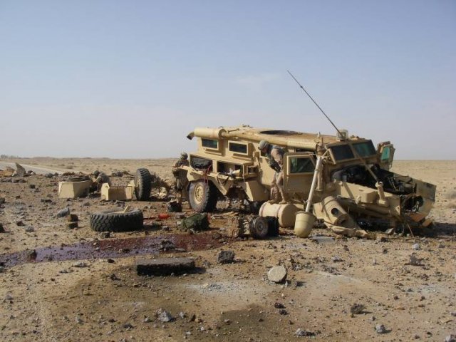 This Cougar was hit in Al Anbar, Iraq by a directed charge IED approximately 300-500 lbs in size. All crew members survived the blast and went out the next day.