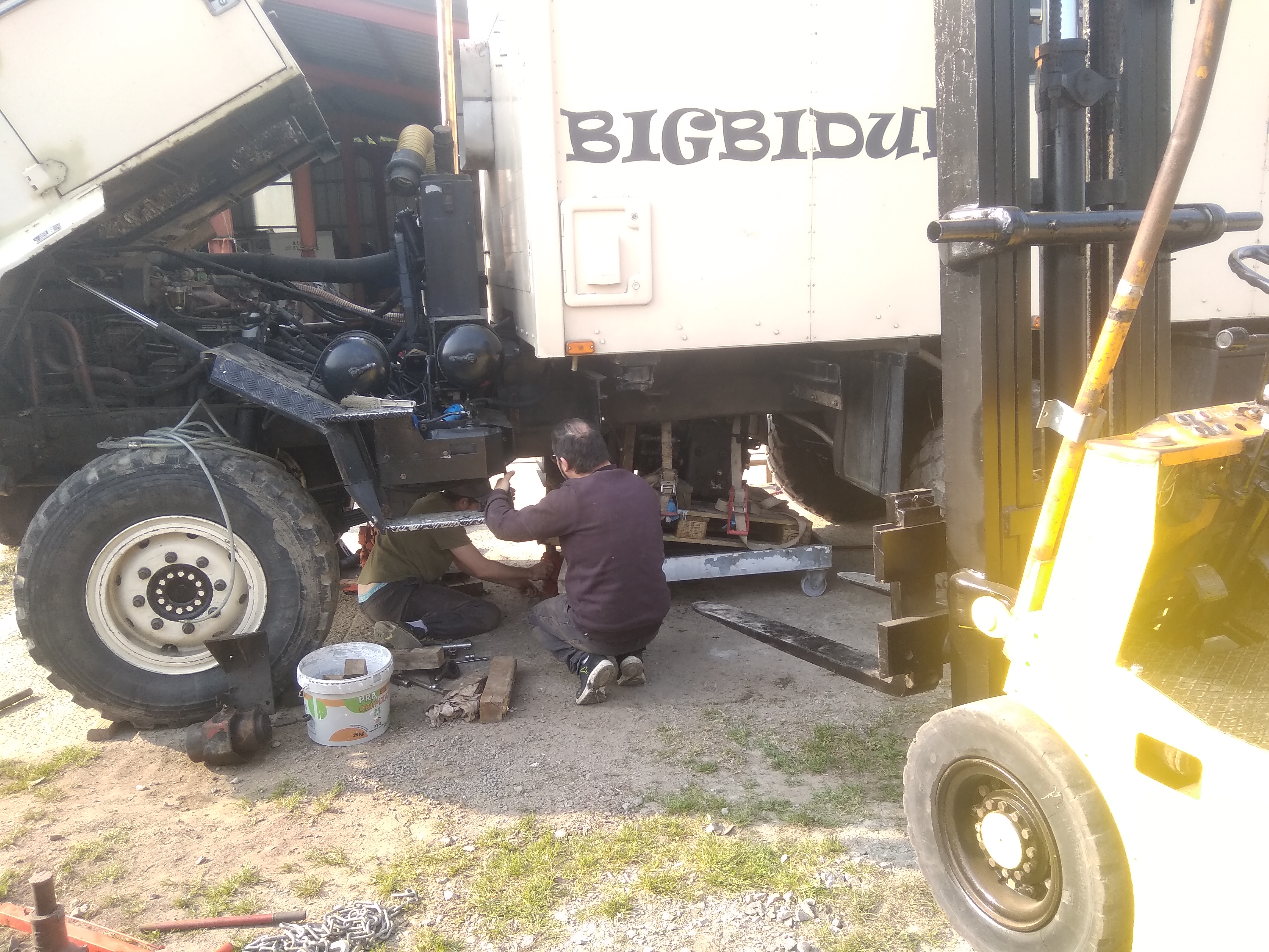 On met le camion sur cale, on dépose les roues, les réducteurs et étrier qui on baigné dans le sel lors des tanquages en Iran mérite une bonne restauration!! Qué quon à fait?