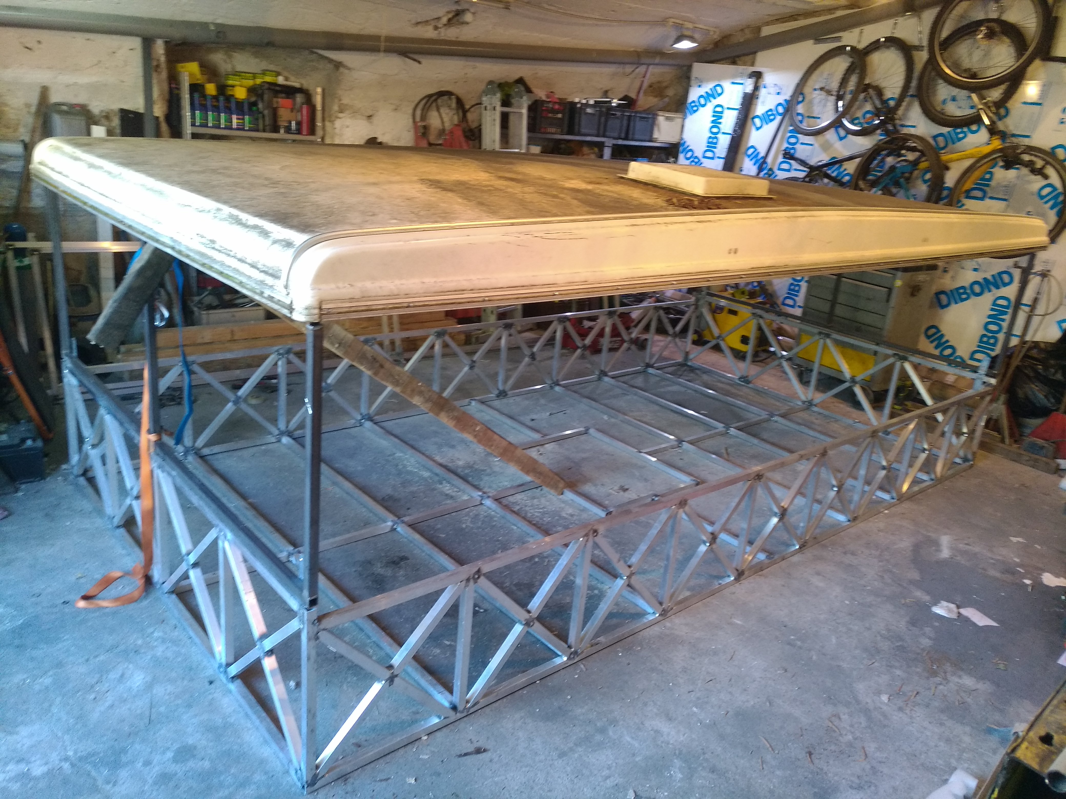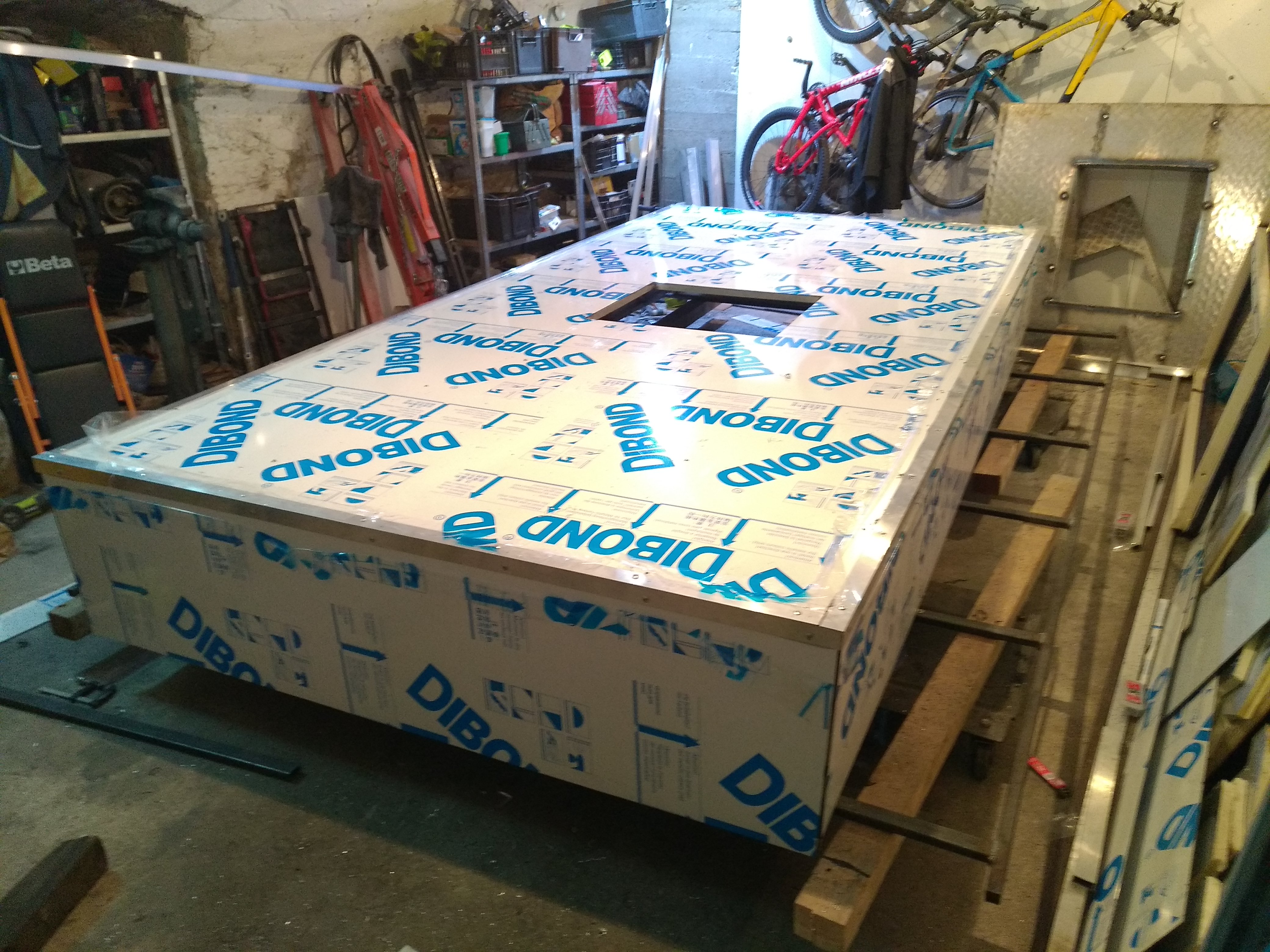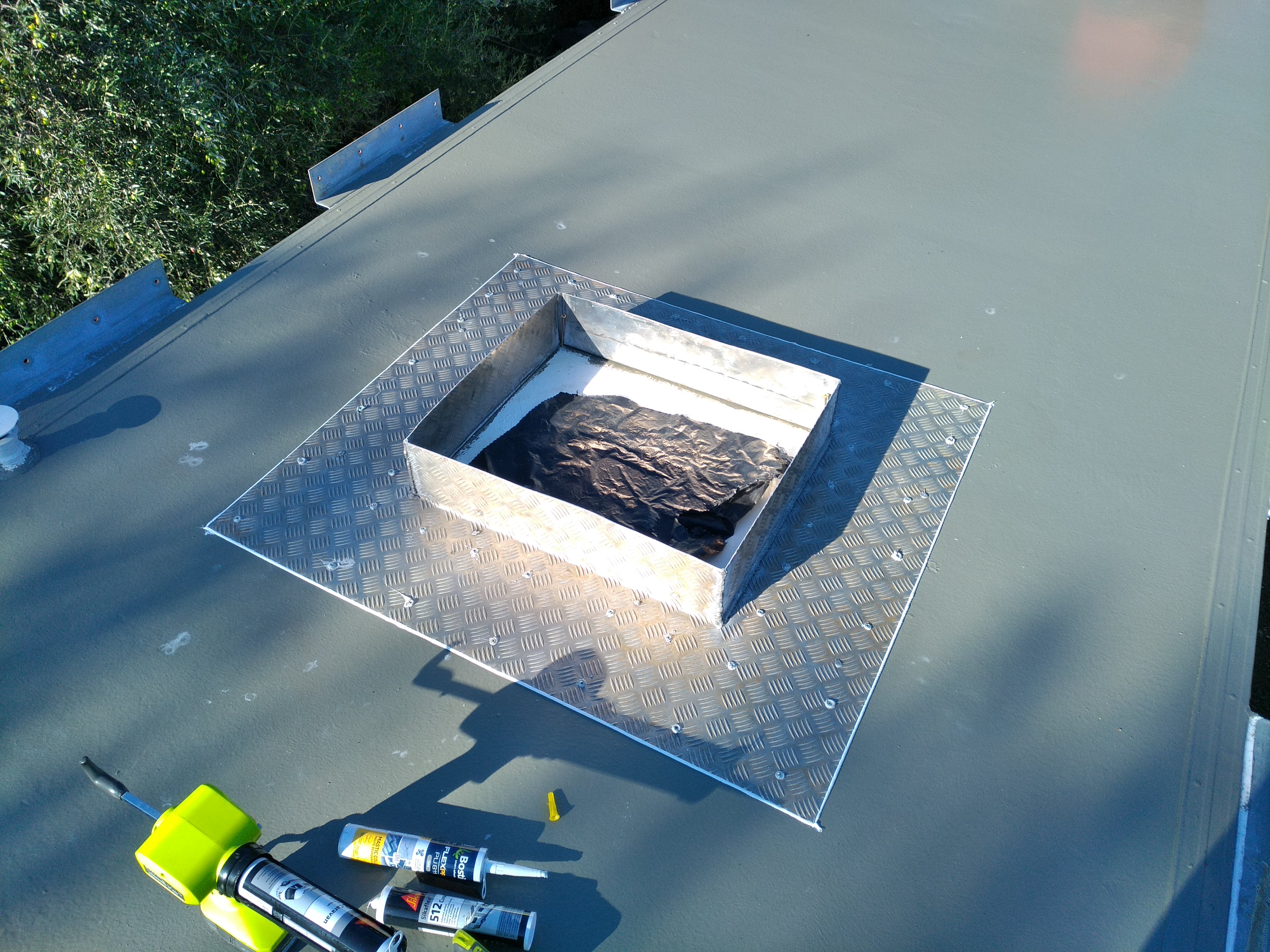ça c'est la "cheminée " collée sur le toit du camion et qui (quand l'ouverture sera faite) servira de passage entre le rez de chaussée et les chambres via une échelle ...