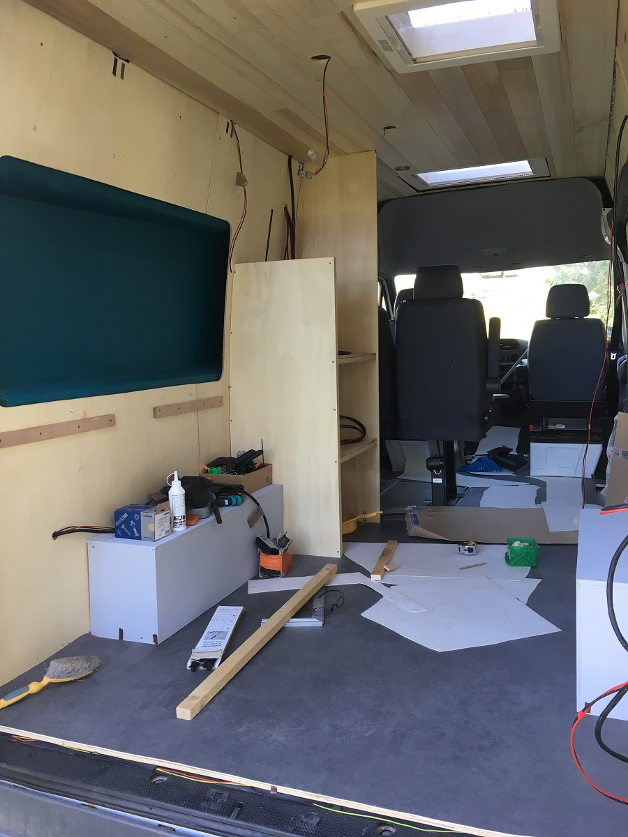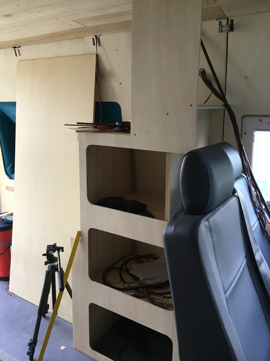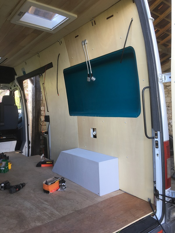 habillage des parois en cp peuplier 8mm et des parois des bajoues en sky. au sol, cp marine de 12mm...Les gaines et câbles électriques sont tirés un peu partout au cas ou...