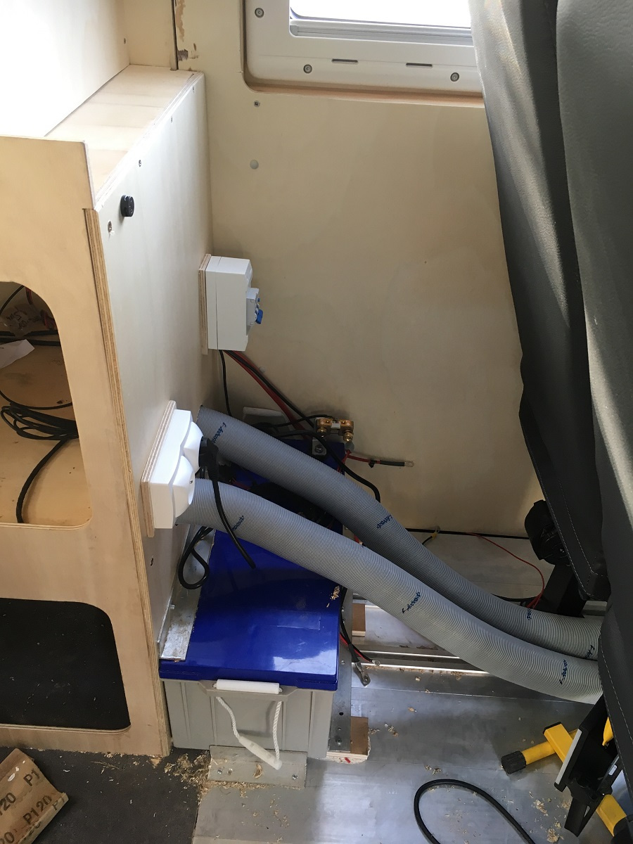 une batterie gel de 200Ah (si je doit gagner des kg à la fin je sais par ou commencer : 60kg la bestiole!) Au passage on voit les gaine du webasto posé en même temps que le chauffe eau chez un amenageur du coin