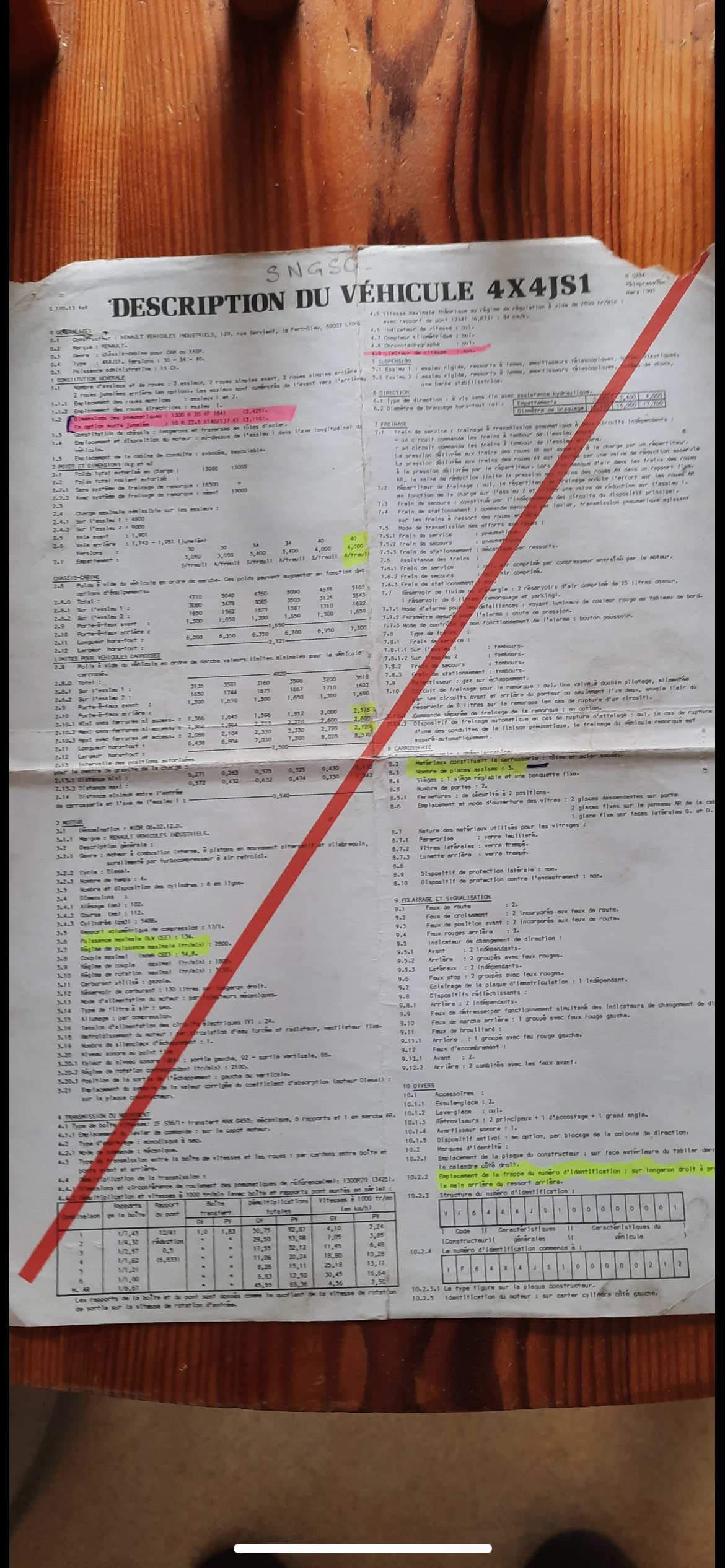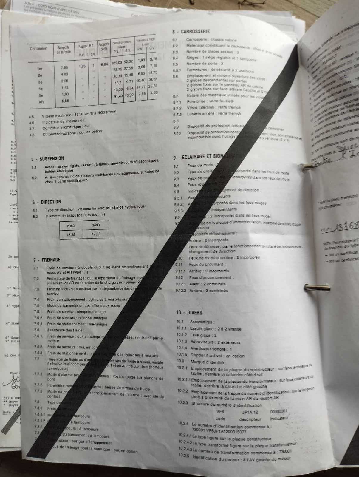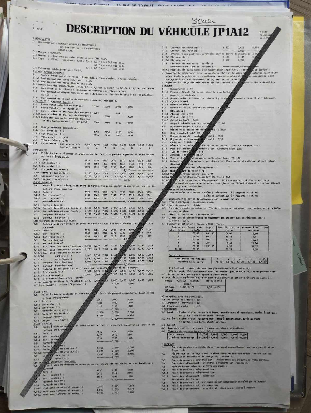 Alors voila, j'ai un Renault JP1A12 S7, 85-150 TI de 1985 ou 1984 de 2.85m d'empattement. J'ai un BR et une notice complémentaire ( Sinpar est passé par la) pour transformer mon 4x2 en 4x4 ( à la base c'était des roues jumelées).