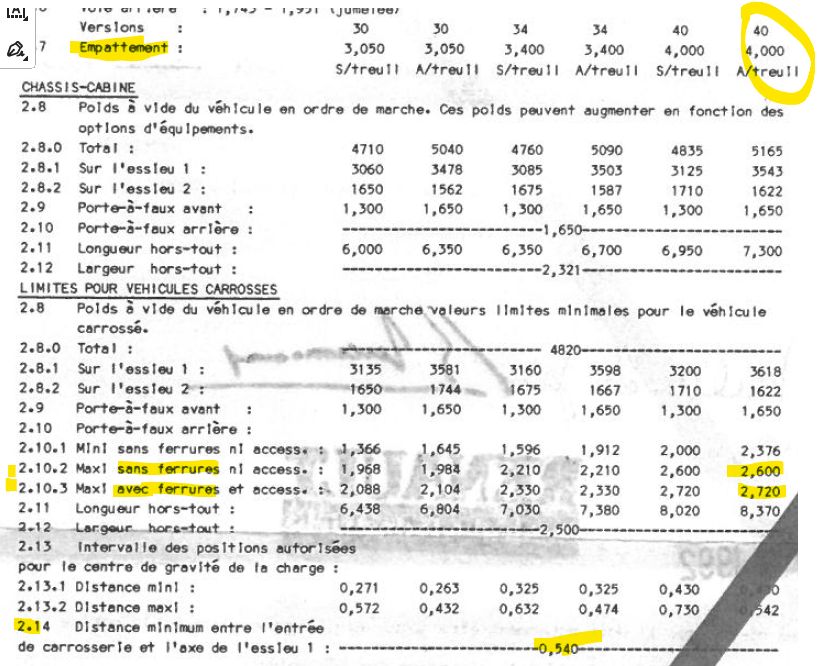Sur le 1er BR l'original ( zoom mis en PJ) avant modification en 4x4, on voit pour la limite carrossable du véhicule : 2.3.10.3 longueur maxi hors tout avec BAE ( barre anti encastrement) 1.906m, la tout va bien ca donne une cellule de :