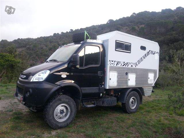 Iveco 4x4 , excellent état prêt à partir, carte grise ctte 3 places fourgon (VL), aménagé pour 2 pers, 220l GO, 200l eau, chauffe eau et chauffage gasoil, cabine de douche, coin cuisine avec évier, plaque gaz 2 feux, frigo 40 l, coin repas 4 pl transformable en couchette 200 x 150, nombreux rangements, 3 batteries service de 110 w, couplées au moteur et reliées à 2 panneaux photovoltaïques, wc chimique, réservoir eau noire 80l. 4 amortisseurs état neuf adaptés, plaque de protection moteur, support moto amovible, 2 roues de secours, 2 sièges baquets. Prix à débattre