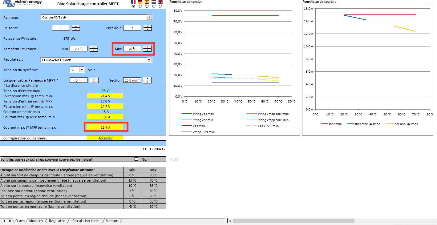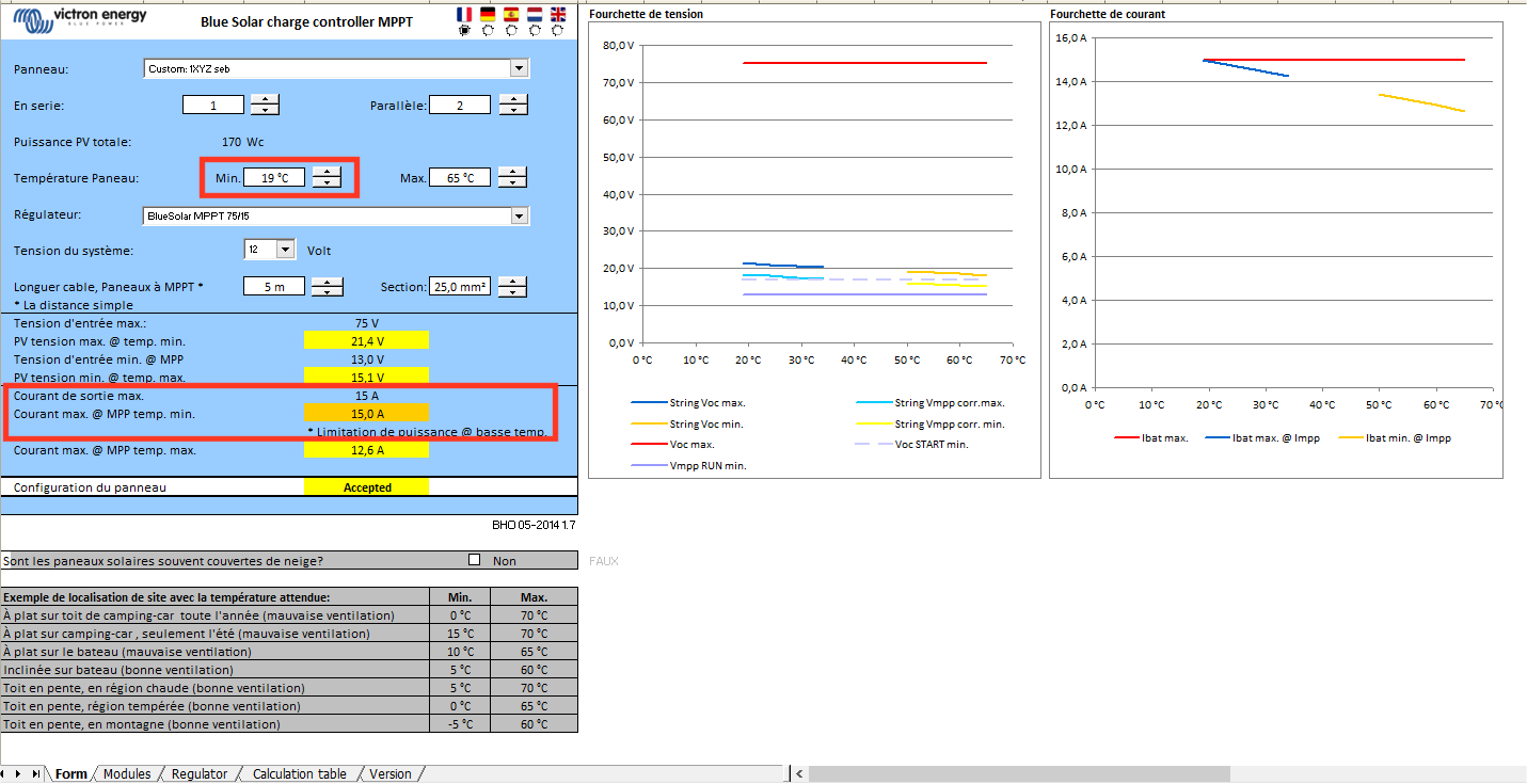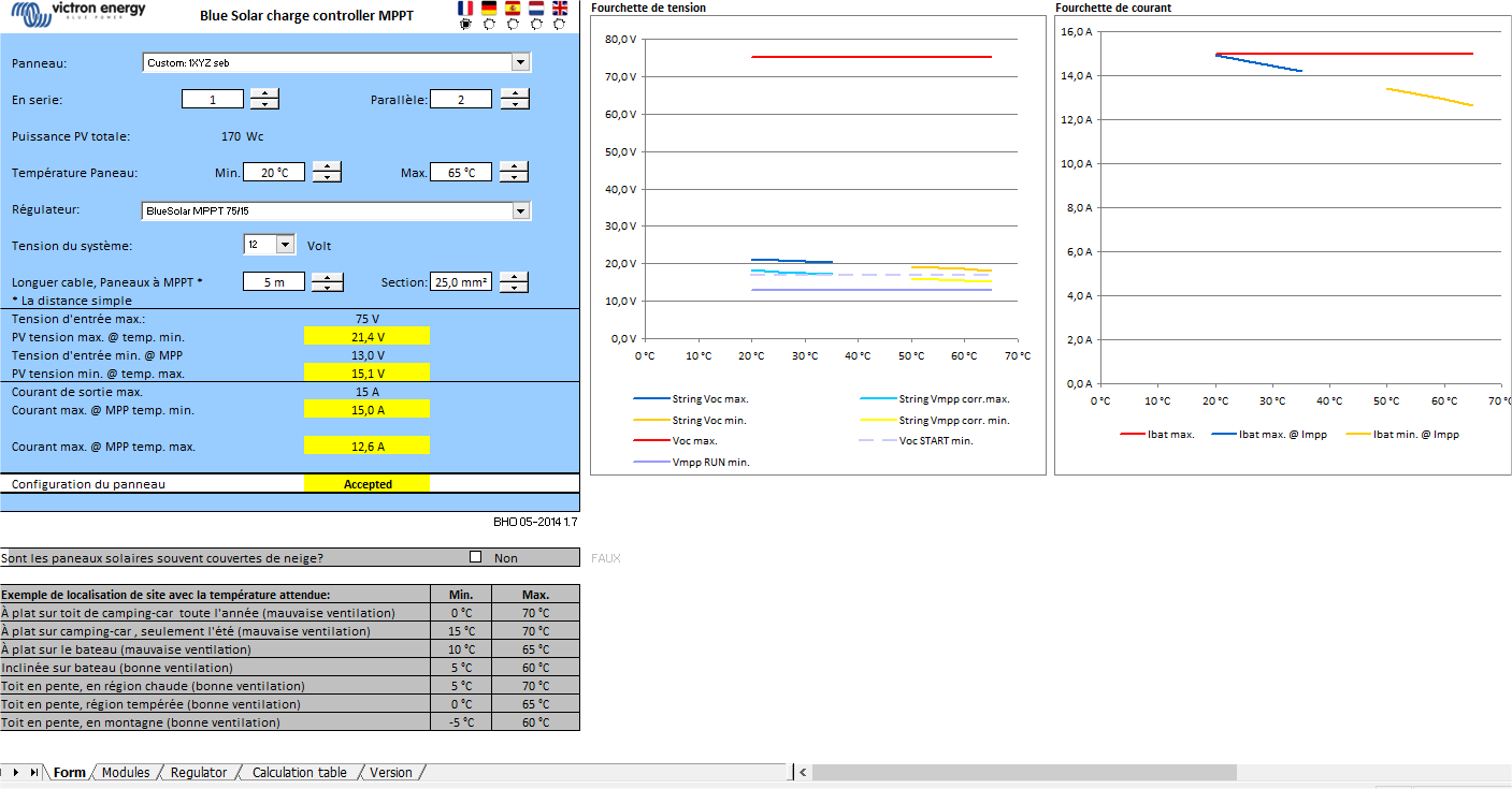intéressant ce simulateur. j'ai pas tout compris dans les diagrammes mais j'ai simulé avec mes futurs panneaux et le régulateur qui sera un 24V 75/15.