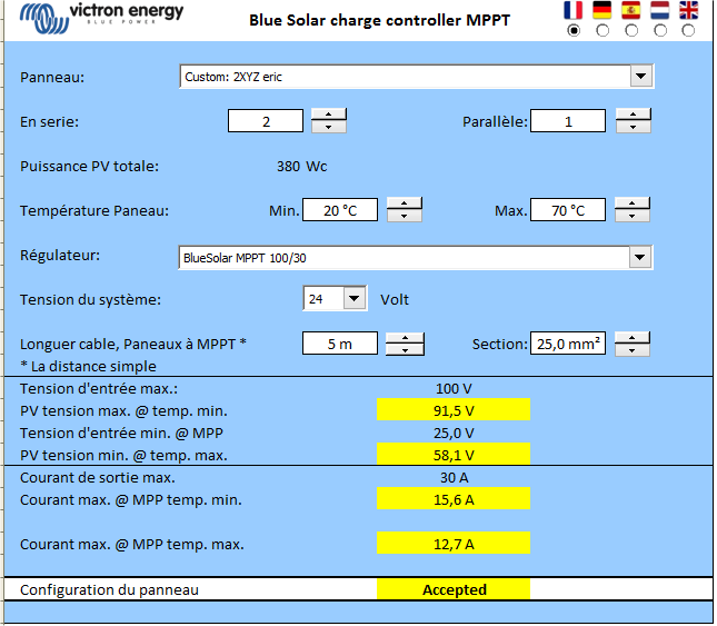 Eric, je crois me rappeler que tu as 380W de panneaux (2 de 190W en "24V" ) de panneaux donc j'ai rempli le simulateur :