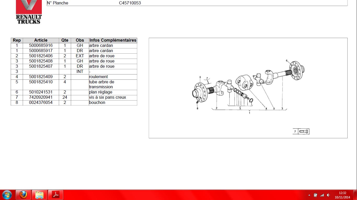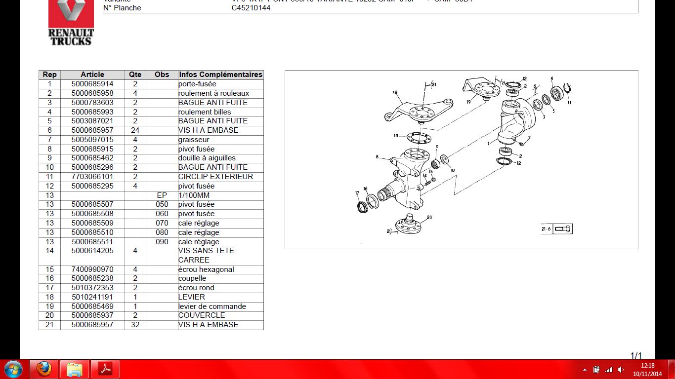 je demonte l'av pour voir les plaquettes et s'est la que je constate le jeux très important au double cardan, s'est a dire que la cardan tombe littéralement dans le pivot car elle n'est plus tenu dans le moyeux par le roulement (9 sur le schéma)....ce b a de très nombreuse fois été chez rvi montauban on lui notamment changer le pivot gauche mais il on du remonter la cardan dans le pivot sans roulement car les 2 coter sont baiser....bref sur un cam 30000€ ça la fout très mal...