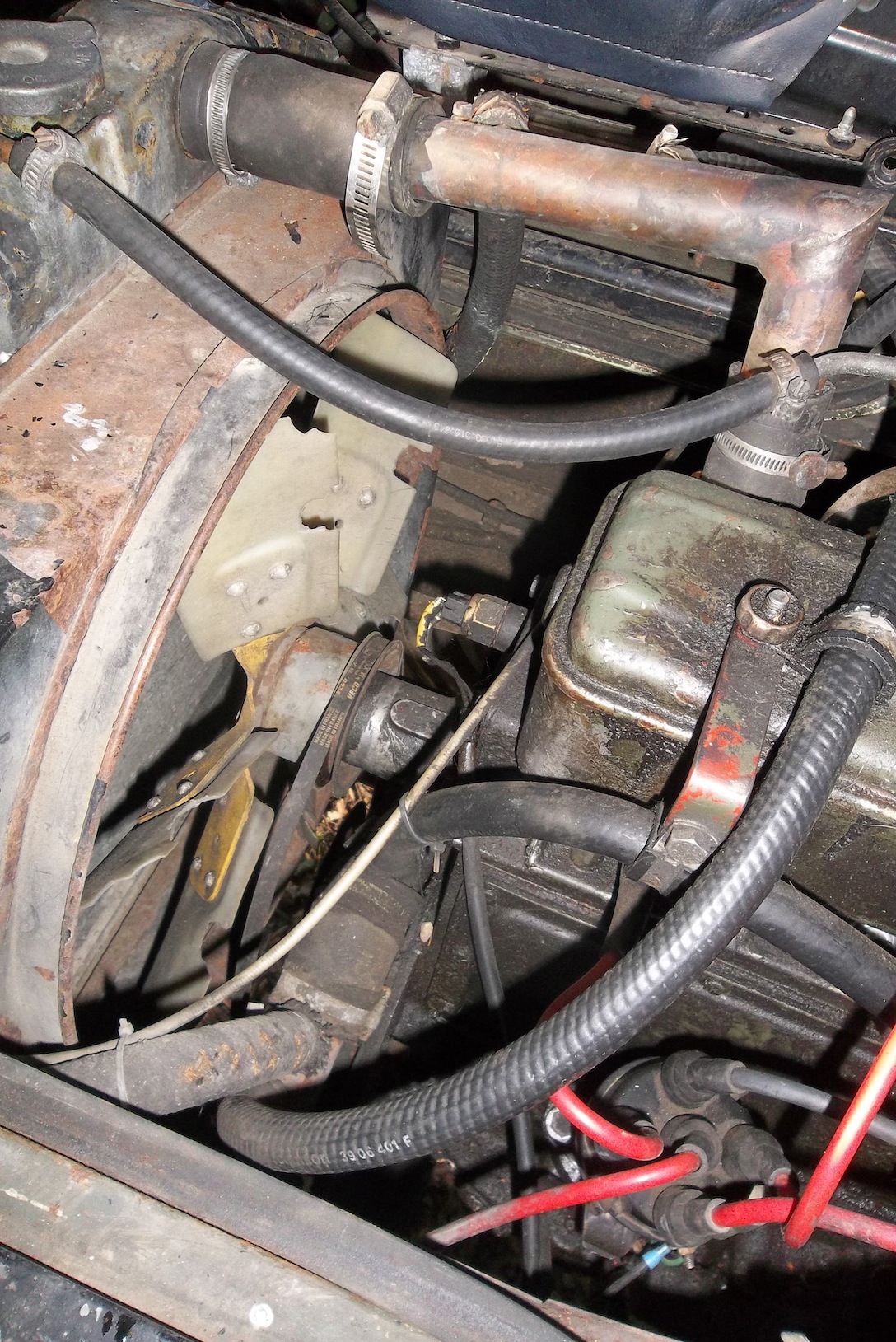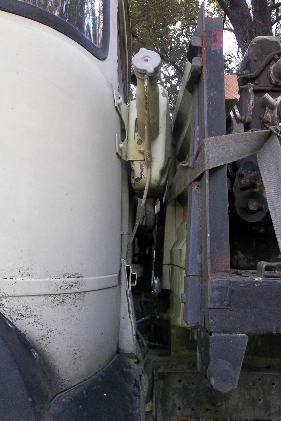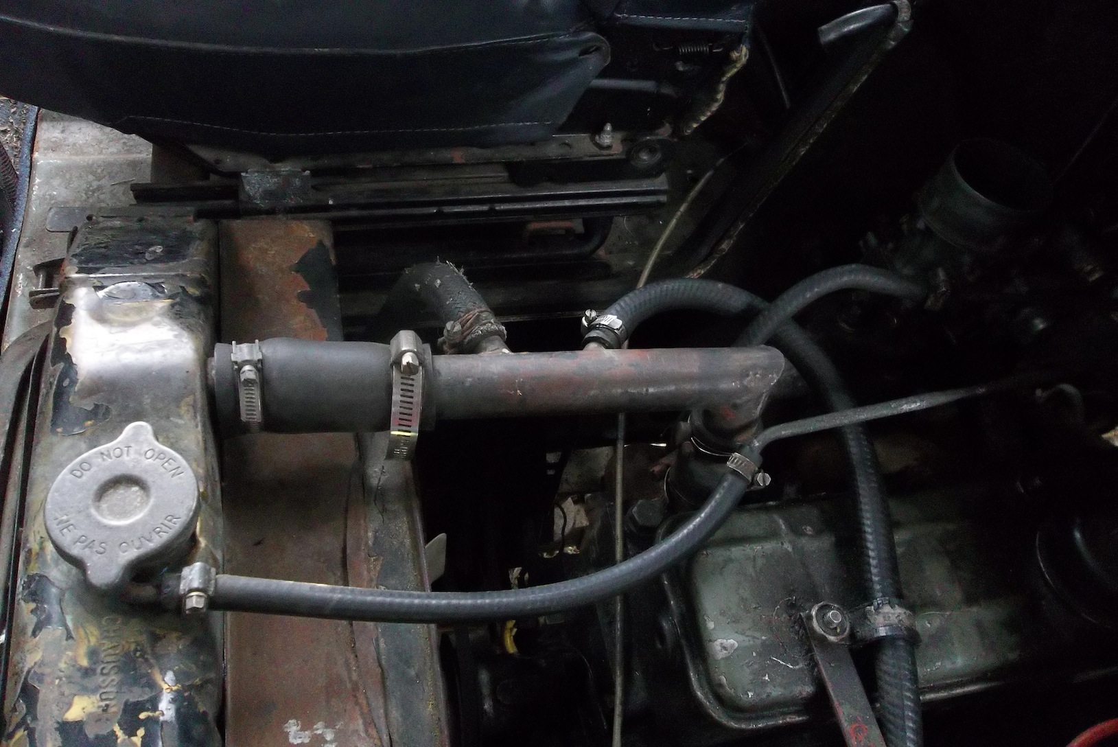 ...ce qui me fait me rappeler que le circuit de refroidissement N'EST PAS sous pression car il y a une durite de mise à l'air libre sur le vase d'expansion (on la voit sur la photo, elle plonge derrière la cabine).