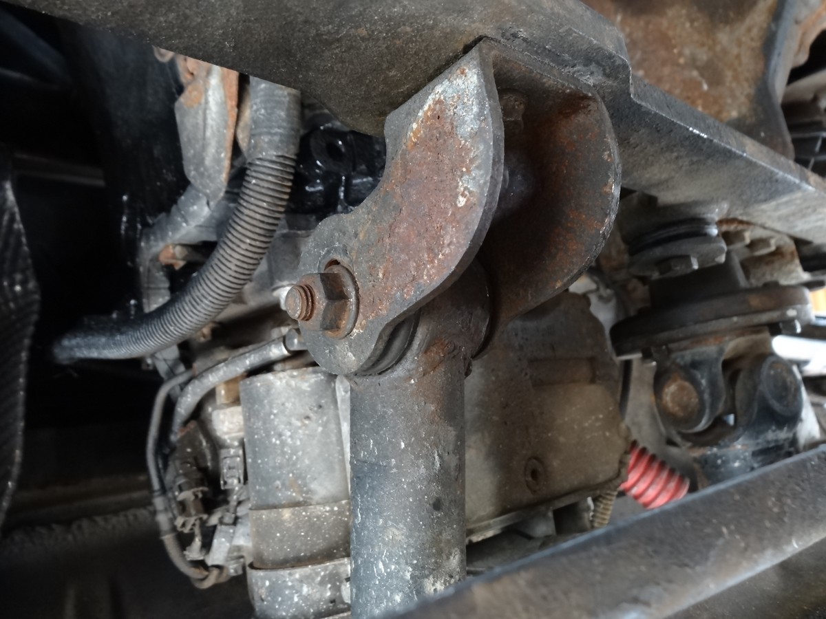 - j'ai démonté la grosse barre ronde qui est entre la BT et la traverse avant : c'est toujours pareil (cette barre ronde n'est pas dans tous les montages. A l'avant, elle est montée sur un silentbloc et une fixation sur la traverse qui comprend 2 boutonnières, ce qui doit permettre un réglage de l'alignement de la BT)