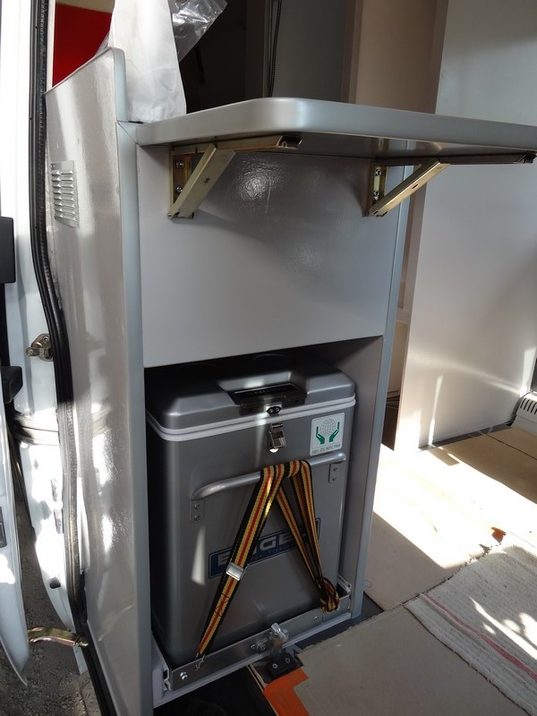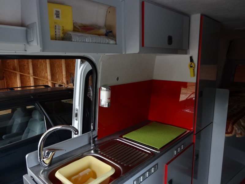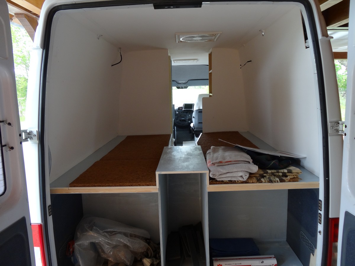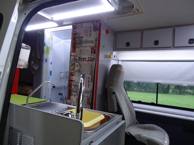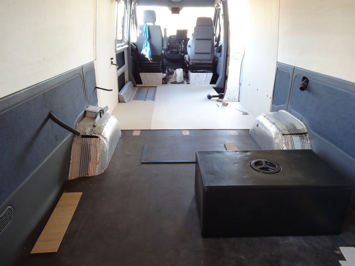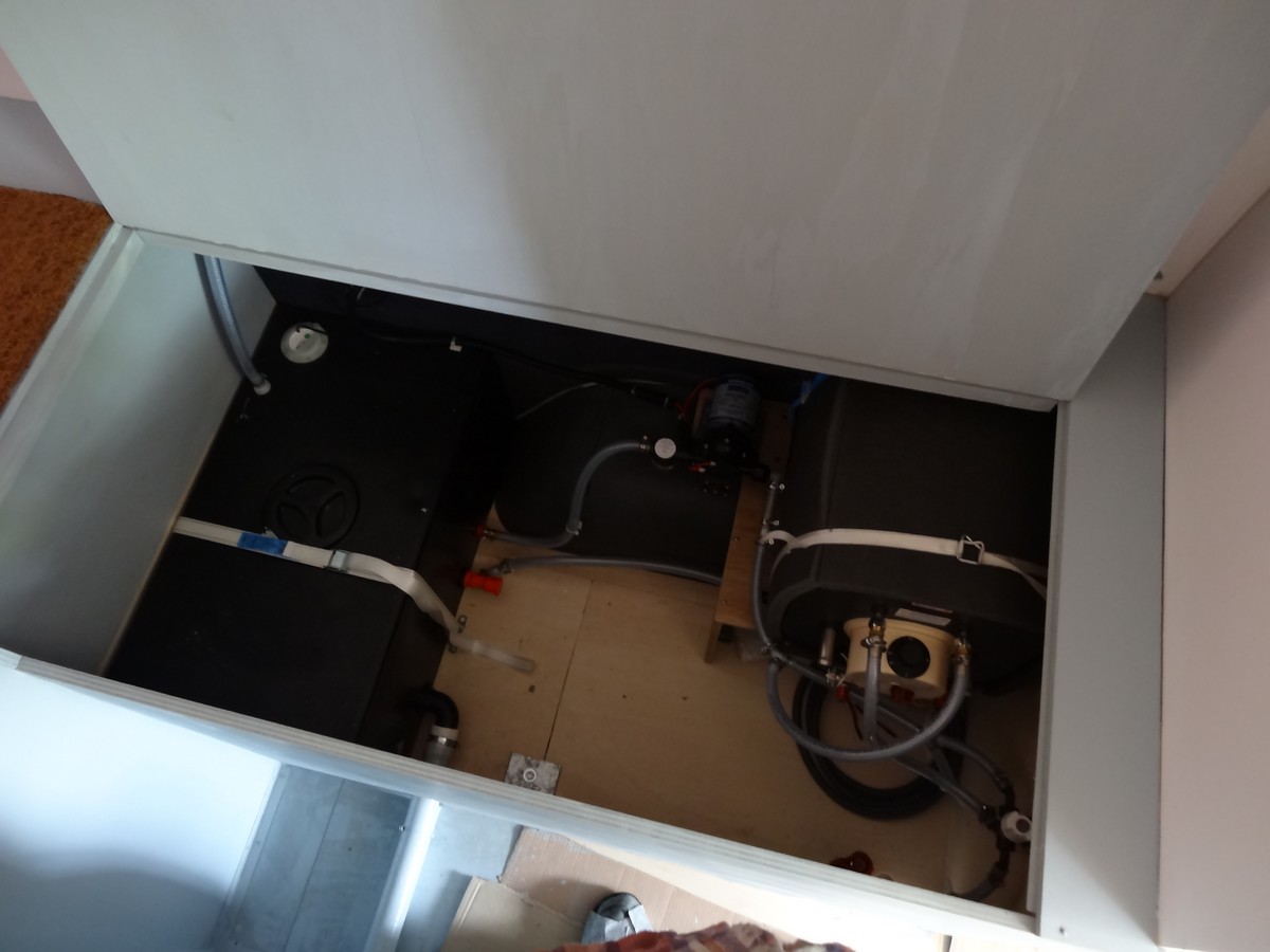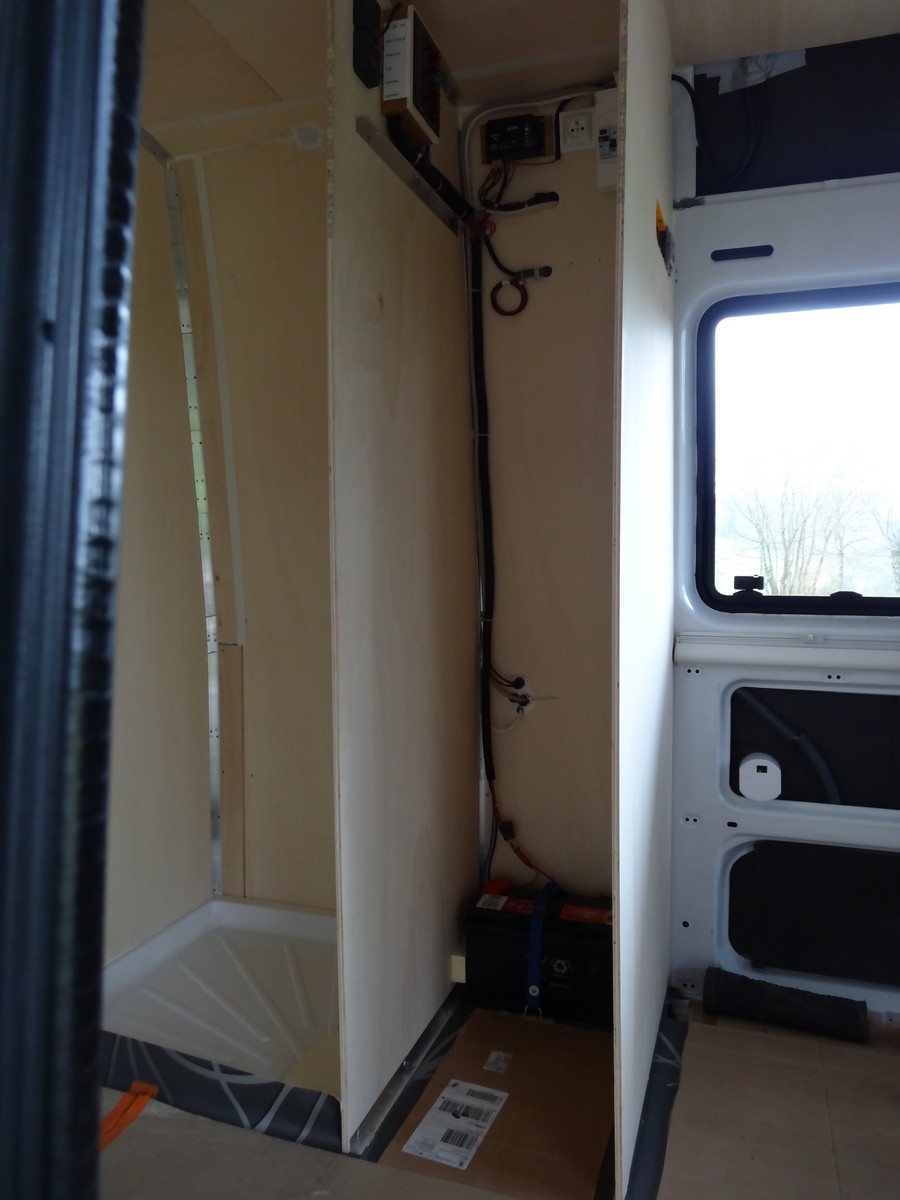 Dans la penderie > en bas au fond : la batterie auxiliaire, devant, au sol : emplacement pour le WC, en haut : partie électrique