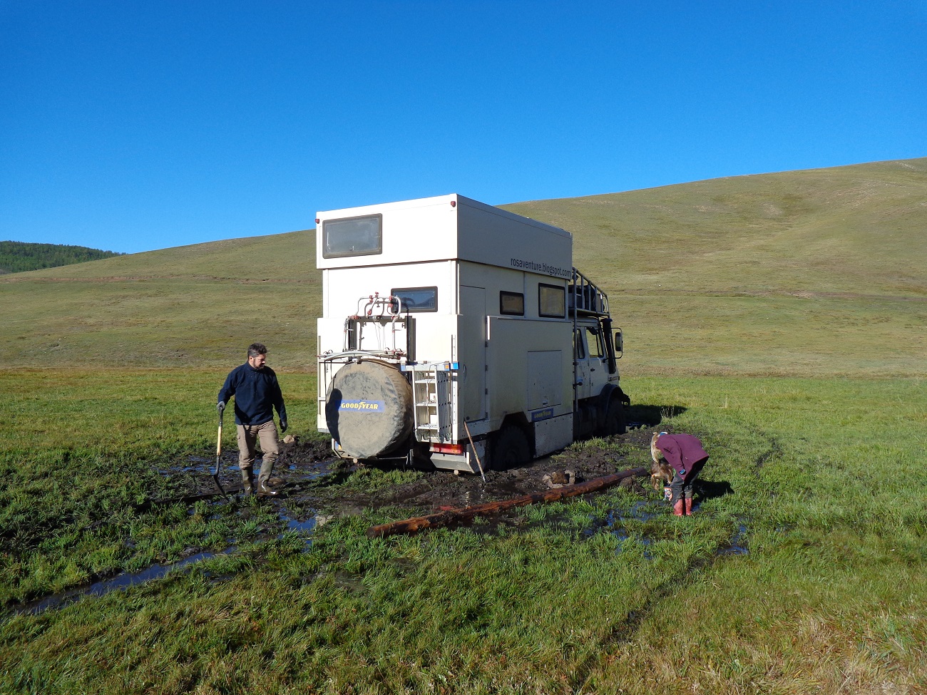 Eh oui, même l'Unimog a ses limites, surout quand il est chargé comme le nôtre.
