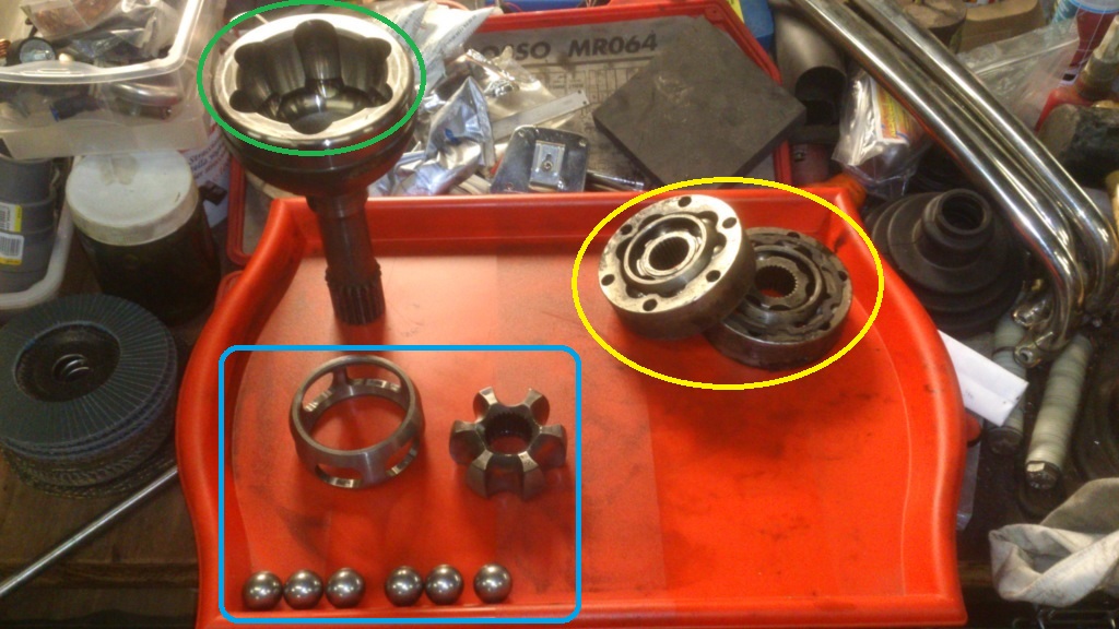 donc après le gros bruit qu’il y a eu en sortant du circuit des petit gros je me suis mis à démonter mon pont av et la mauvaise surprise 1 des 2 joints homocinétiques hs , la cage à billes en mille morceaux.