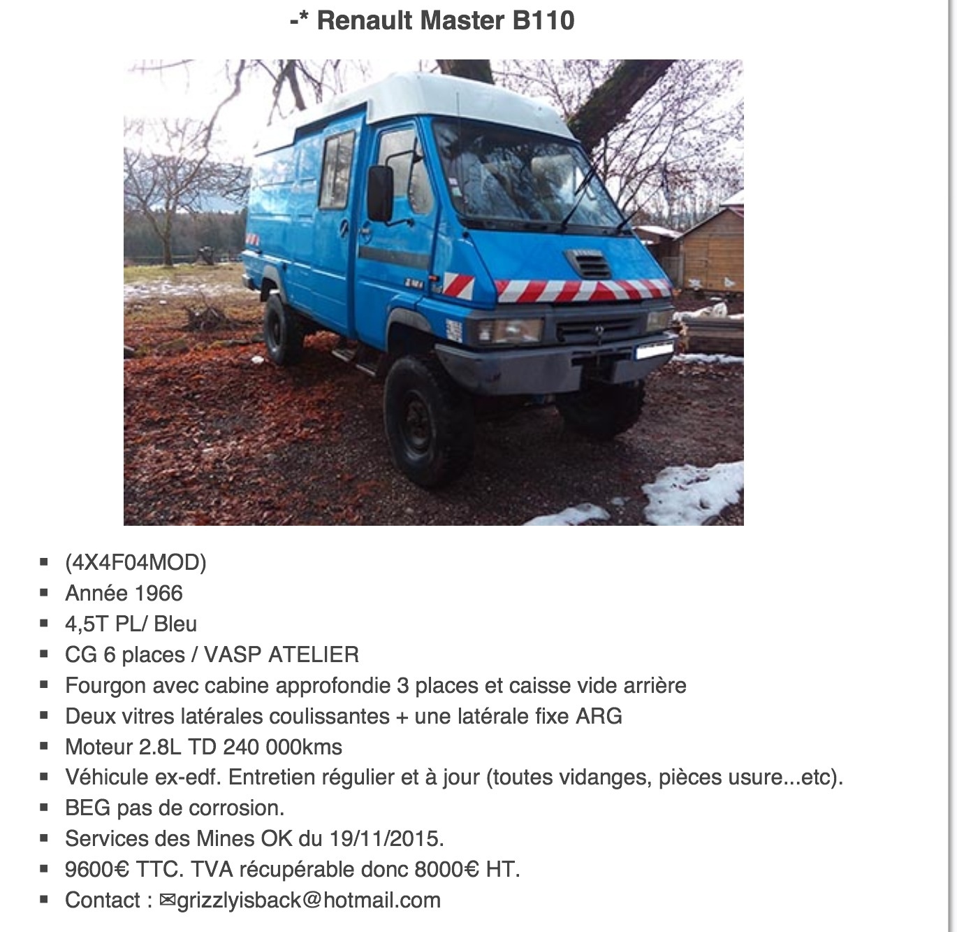 Voilà après avoir voyagé avec plusieurs 4X4 plus ou moins exotiques (pajero,l300, PS10 en vente) je cherche la taille au dessus. J'ai repéré plusieurs fourgons 4X4 dont le B110. Je connais très mal l'engin et je viens vers vous afin de mieux le connaître avec ses qualités et ses défaults. j'ai vu qu'il existait plusieurs montages de ponts, quel modèle faut il privilégier? Est il facile de trouver des pièces pour ces engins qui ont plus de 20 ans. Faut il privilégier son concurrent direct l'Iveco?