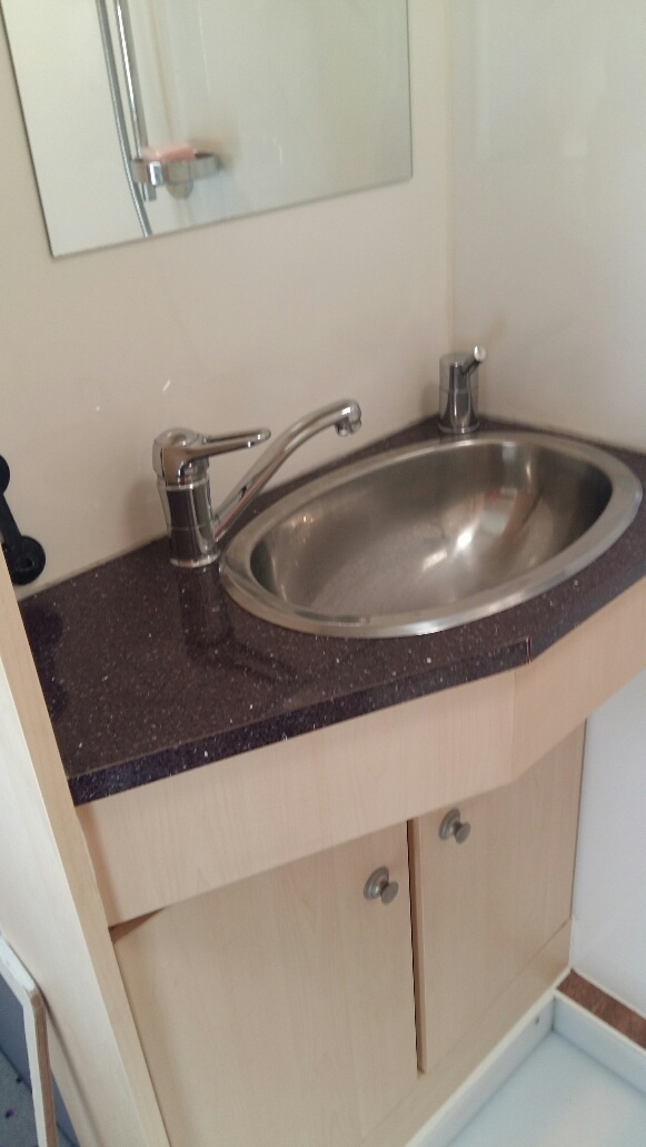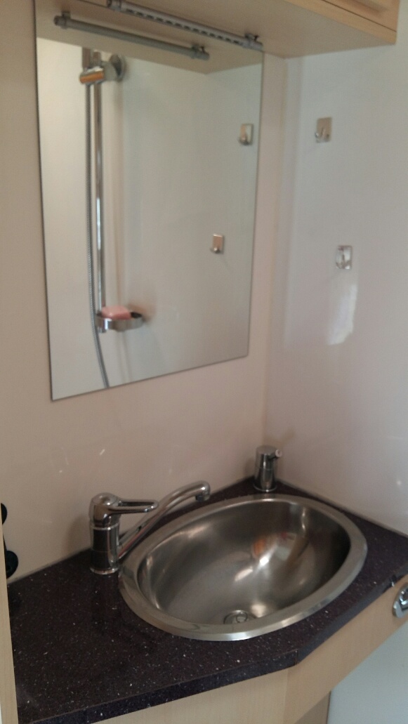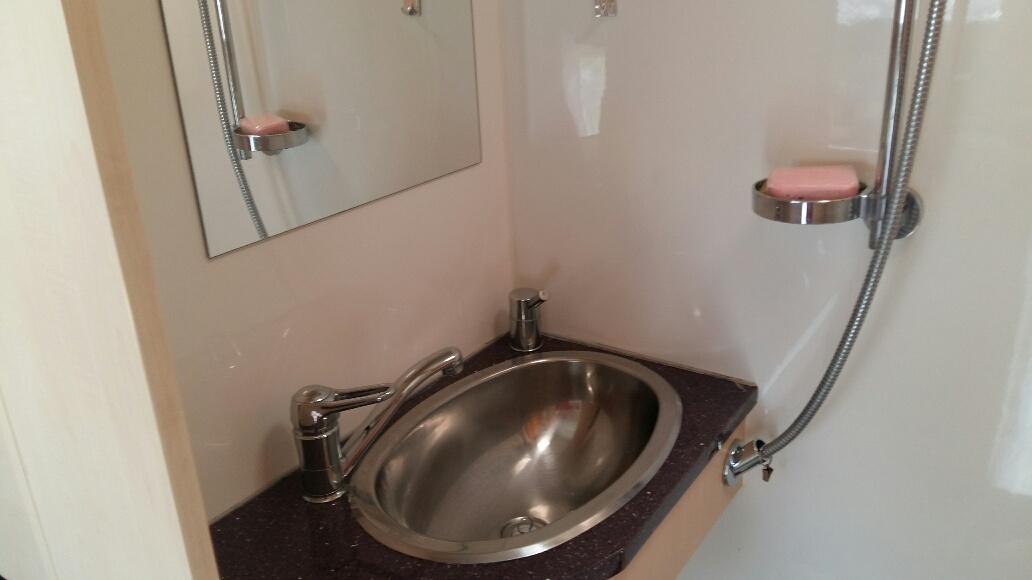 Lavabo sur tablette douche avec rideau
