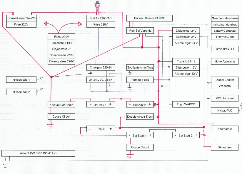 NB - Les traits en rouge dénotent des câbles de grosses sections.