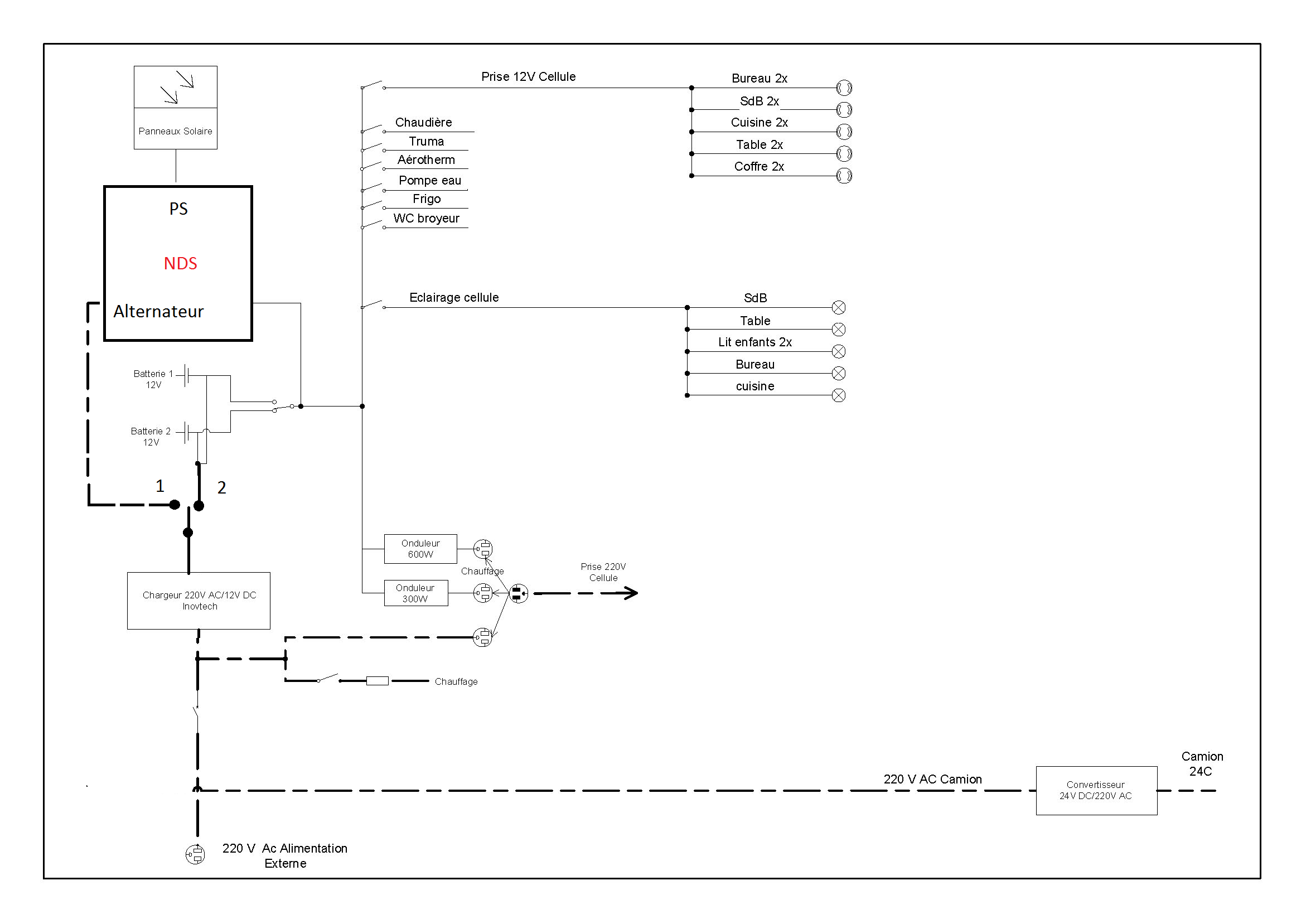 Ha, j'ai compris il y a une erreur sur le schéma, le convertisseur (24Vdc/220Vac) branché sur les batteries moteur fournie à partir du 24Vdc du 220Vac, sur lequel est relié un chargeur 220Vac/12Vdc qui est relié sur la batterie 12V, le NDS est relié aussi sur la batterie 12V.