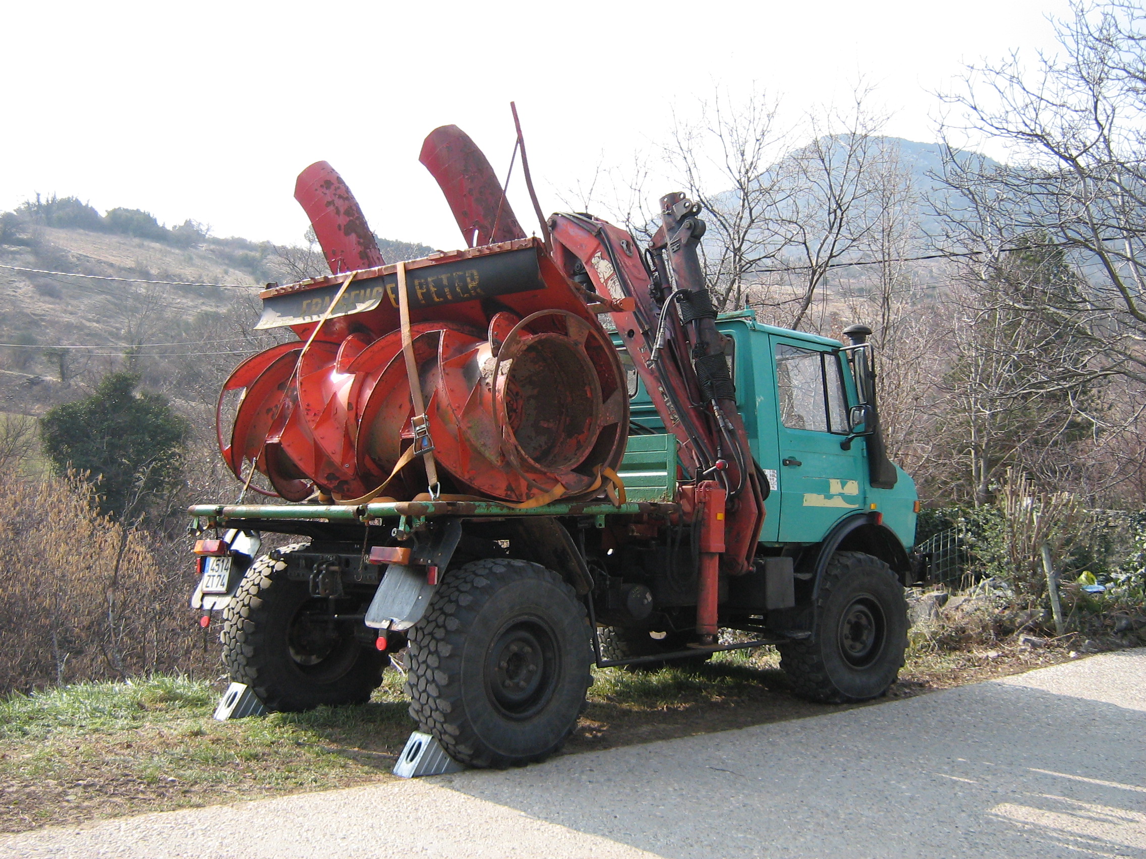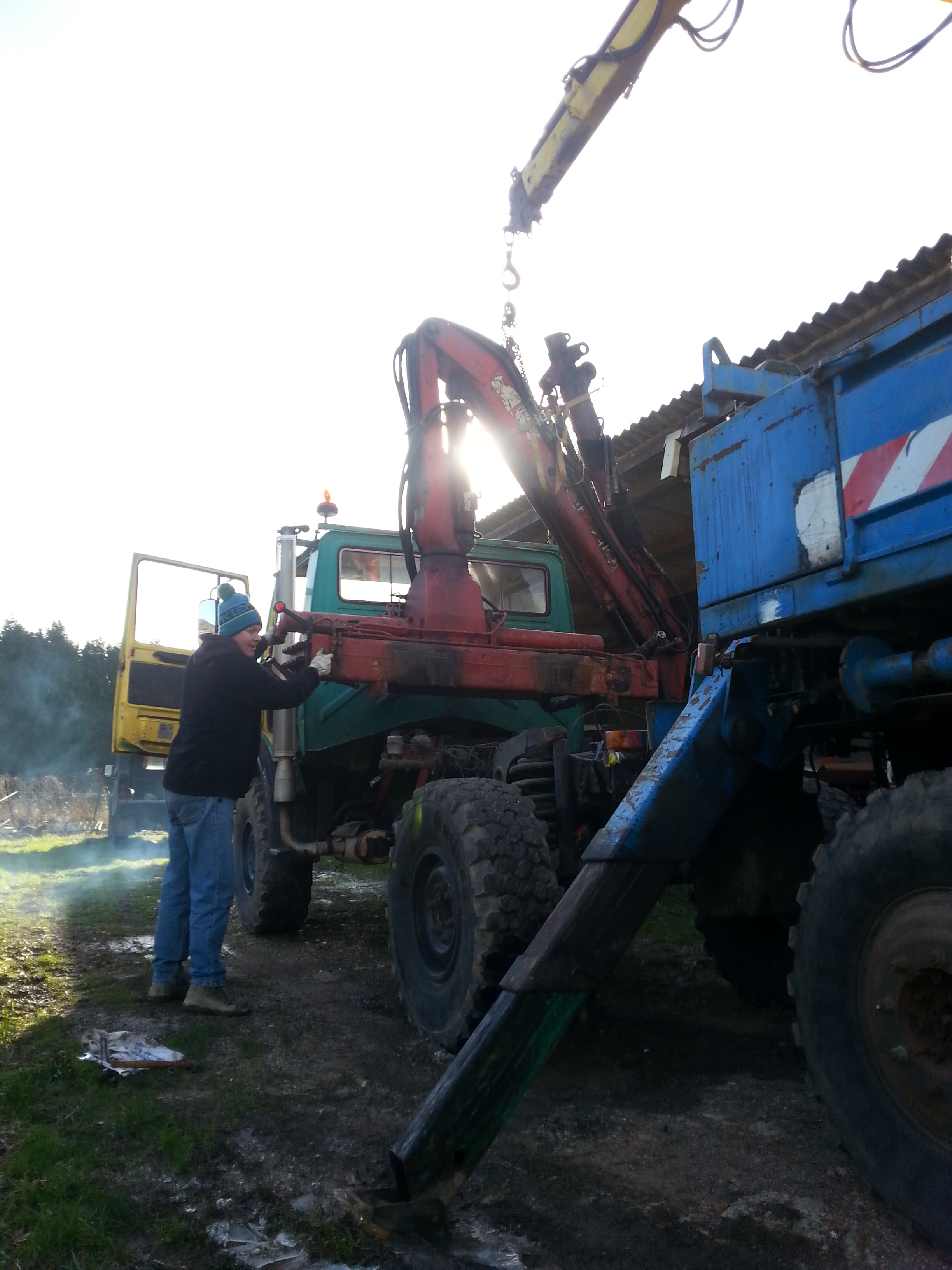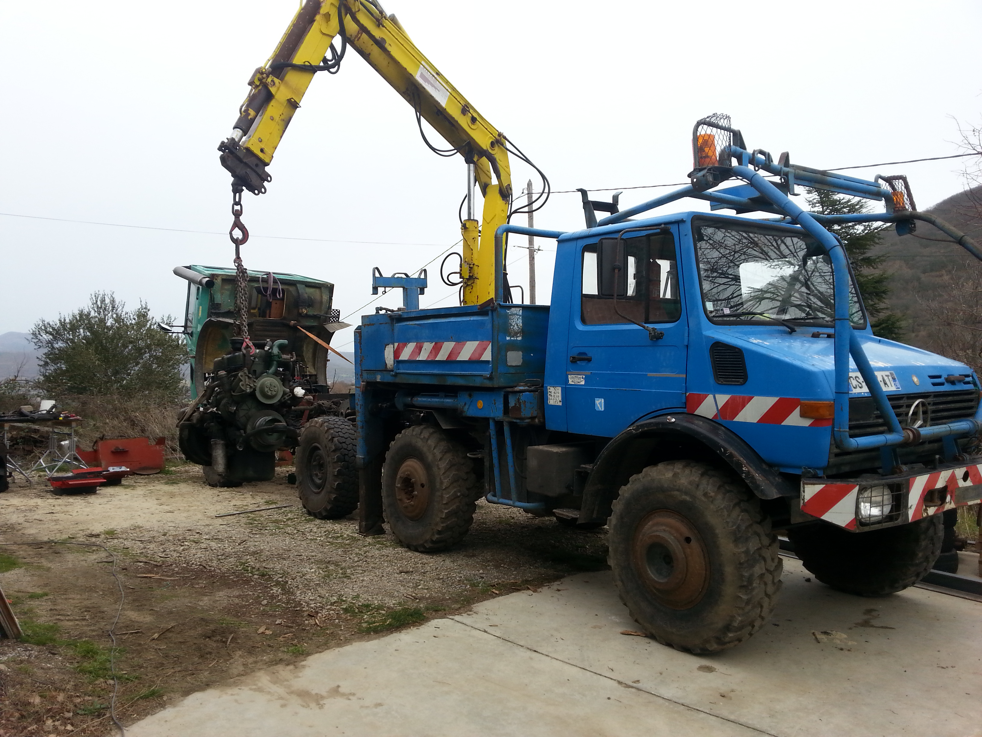 La grue sur un mog, c'est super mais à chaque rond point un peut rapide on a le sentiment de se coucher, je décide de déplacer la grue sur l'avant de la remorque, comme ça le mog sera libre ! Mais après un été d'utilisation bien chaud je constate que la pression d'huile moteur est dans le rouge, il est donc temps de prendre soin du lui.