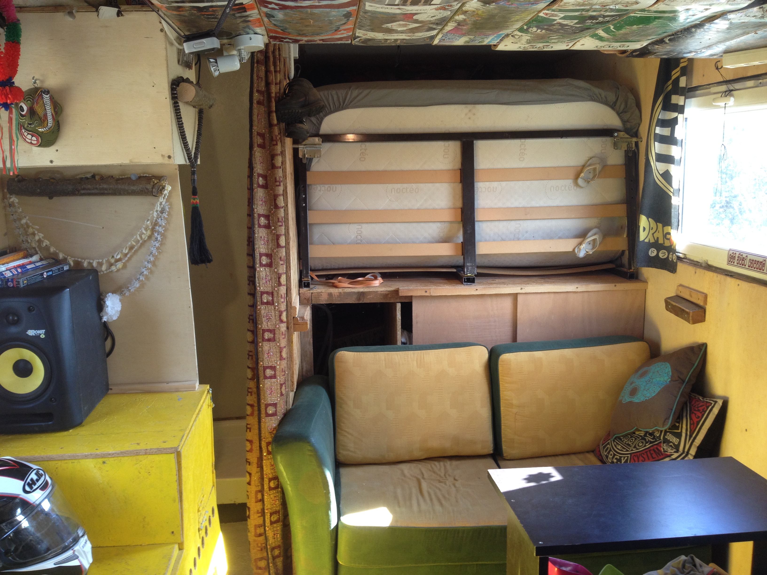 Une partie salon avec une banquette sur roulette, un canapé dépliable en lit 2 places, de nombreux rangements.