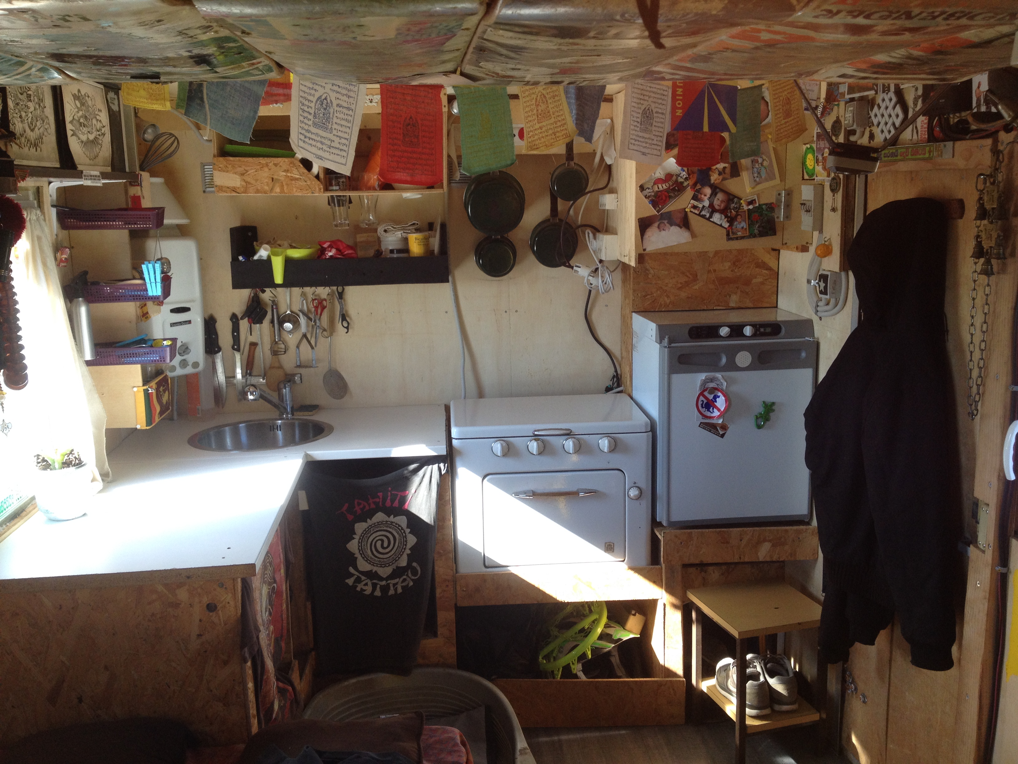 Une partie cuisine avec plan de travail, évier, gazière, frigo trimixte 60L, chauffe eau à gaz SAUNIER DUVAL,