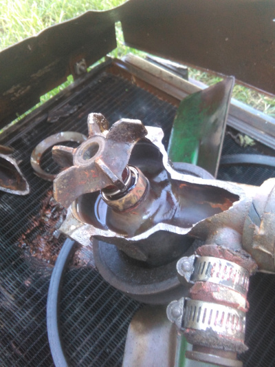Après investigations, c'est une des pales en tôle qui était rouillée au niveau de la poulie (on voit bien les petites parties qui ont cédé à la fin). Elle est venue frotter fort sur le radiateur avant de casser et de provoquer la casse du corps de la pompe, du moins c'est ce que je suppose... vivent les ventilos électriques !!!