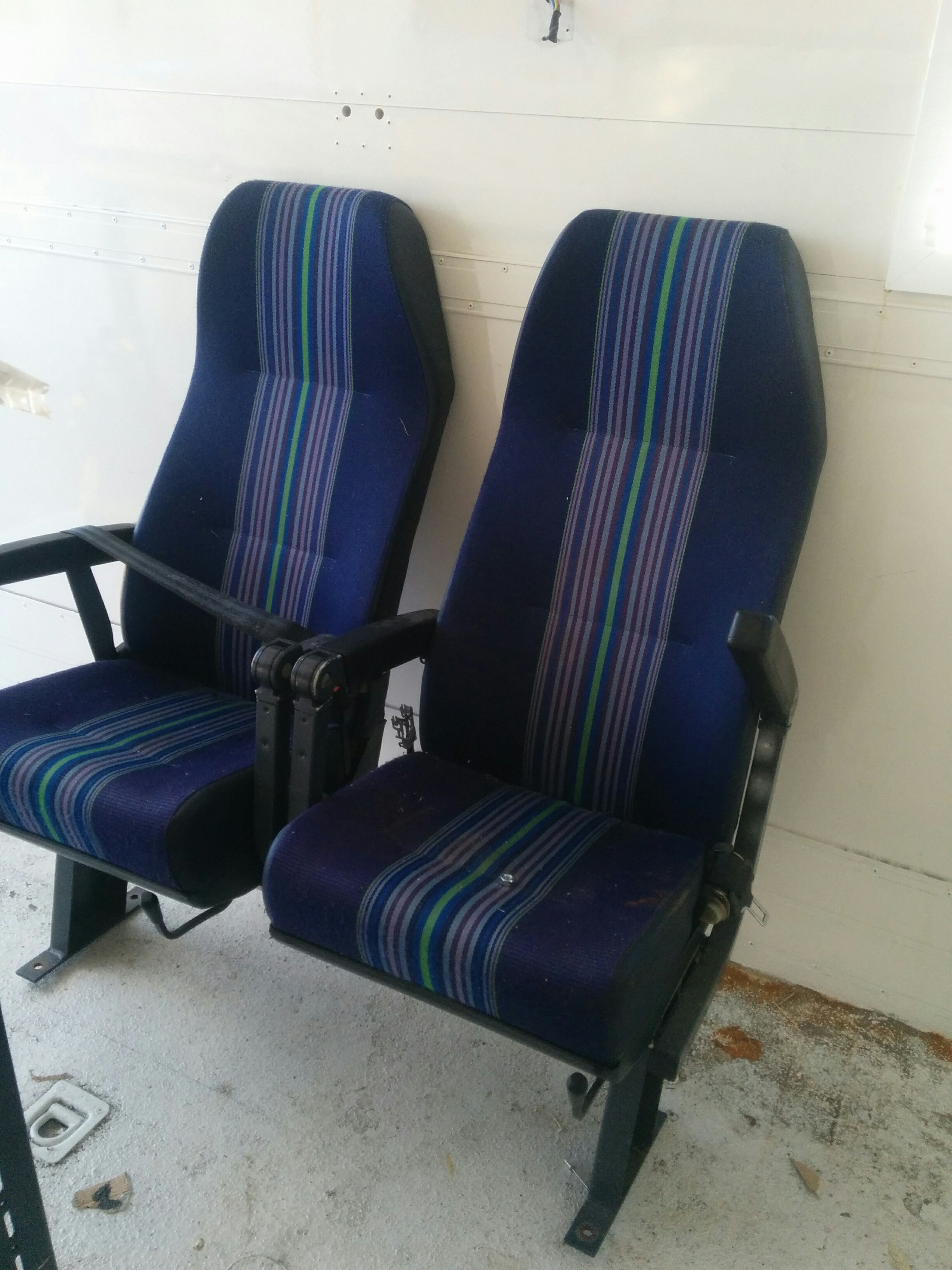 nous avons achetés il y a quelques mois un camion Renault 110/170 (le Tortuga), des sièges étaient vendus avec mais après réflexion nous n'en avons pas l'utilité donc nous les vendons. Il y a deux sièges de bus avec ceinture de sécurité, couleur bleu et deux sièges de camion, sans ceinture de sécurité de couleur beige. Nous sommes pour l'instant sur Toulouse et nous montons vivre en seine et marne à la fin du mois d’août donc si ça vous intéresse envoyer moi un MP ou un mail.
