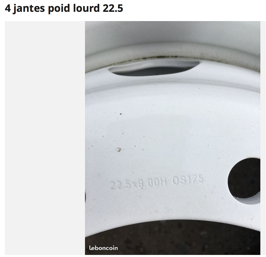 Ce sont les pneus qui sont en 12 R 22,5 (les 13 x 22,5 sont plus nombreux et très proche des 12.00 R 20) les jantes sont en 8,25 pour nous mais pourraient être en 9 x 22,5, (9 voir 9,75 x 22,5 c'est mieux pour les 13) mais c'est nettement plus facile à trouver que les jantes à cercle d'origine...