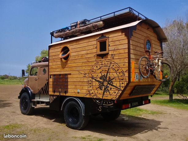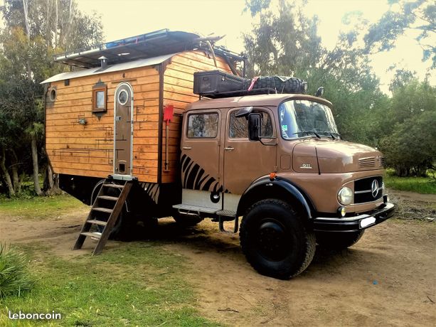 Superbe Mercedes 911 4x4 collection de 1976. carte grise 7places, double cabine, VASP. Peu acceuillir une famille de 4 ou 5 pour un voyage. Acheté il y'a 2ans dans une concession mercedes avec 14000km d'origine(papier à l'appui avec carnet d'entretien), 1ere carte grise à mon nom et contrôle technique vierge jusqu'en 2021. De nouvelles lois sont passées plus de contrôle technique pour ce véhicule. Il comptabilise en ce moment 31500km. Je reviens tout juste d'un gros voyage en afrique de l'ouest pour lequel je l'avais acheté.(maroc,mauritanie,senegal,gambie,guinéebissau,conakry,mali..) je suis aménageur et restaurateur de véhicule semi professionnel. Ce statut car je n'ais pas d'entreprise et le fait par pure passion. Plus de 10ans que je redonne vie à de vieux mercedes(mecanique, châssis,carrosserie et les fait voyager!) ce camion encore en rodage mecanique, n'a tout simplement aucun frais à prévoir, toutes les vidanges et graissage viennent d'être refait. Roule tous les jours. Carrosserie neuve. Niveau exterieur: une galerie sur la cabine, avec une malle fixe et la roue de secours, une deuxieme grande galerie sur le toit de la caisse pouvant faire office de terrasse. On y trouve 2 panneaux solaires comptabilisant 560watts. Un système de treuil permet de monter toutes les affaires dont la roue! Autour du camion: 4soutes, un rangement pour l'echelle, 2 rampes de désensablage, 2 caméras de recul, porte 2 vélos, prise ext.. Sous le lit un grand coffre accessible par une trappe sur la caisse. Quand à la cabine une porte arriere servant à l'accés d'un grand coffre à outil. La banquette passager(3 places) peut se tourner facilement coté route ou dans l'autre sens pour donner sur un salon avec table face à une autre banquette mais aussi peut se transformer en grand lit! C'est un clic clac! Tout cela avec des rangements partout et un passage cabine-caisse souple pouvant ce fermer par une porte coulissante avec verrou. Quand à la caisse je l'ai entièrement construite il y'a 1ans sur mesure en tube de 50 metalique avec faux châssis. Isolation 60 de styro au sol et tout le reste en 45mm. L'intérieur à une deco particuliere entre bateau et roulotte. On y trouve, bibliotheque, des barriques avec rangement, des lampes a petrole a leds, un poêle à bois dans un ancien poste à souder, des jeux de lumieres un peu partout,un grand lit 2 places avec tablette pour ordi, une grande niche pouvant se transformer en chambre d'enfant. Une cuisine avec four et plaque, frigo compression 12v 130litres, ranges épices, trappes au sol, douches et toilettes sèches. Coté technique: chauffe eau 12l/min instantané gaz, cuve eau 300litres, système elec tout en victron(regulateur,batterie 220amp, convertisseur pure sinus, cadran visualisation charge.. Tableau niveau d'eau etc) des prises 12et220 partout.des rangements de toute part. Camion autonome et très sophistiqué. Camion neuf et très atypique. Impossible de le comparer à d'autres vehicules! Ne me contacter que par telephone et que si vous êtes très intéressé. je ne répondrais pas au mail.