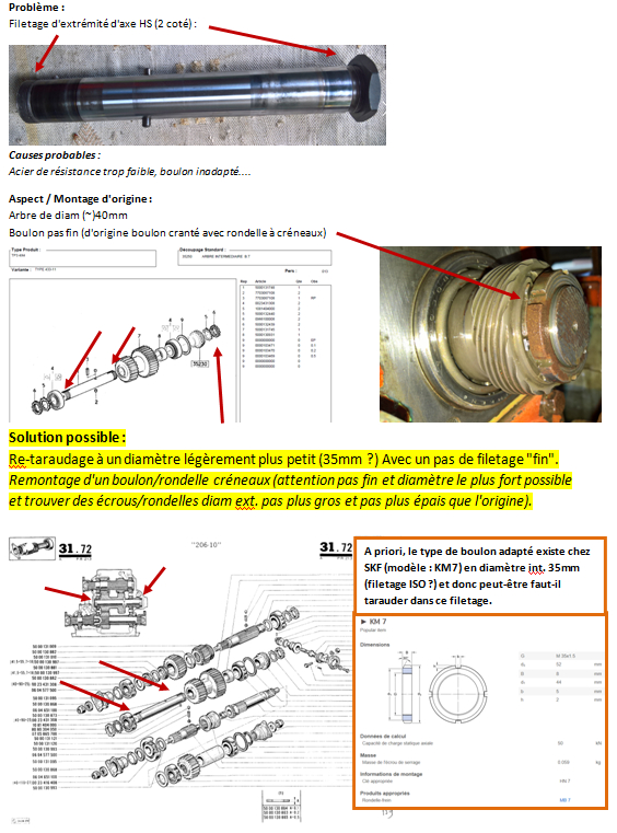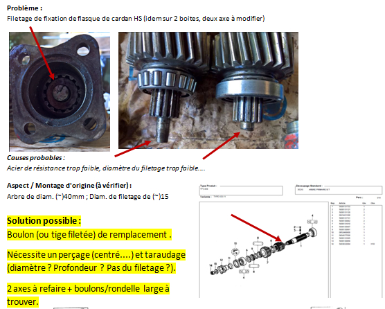 Regarde déjà le boulon d'arbre primaire, assez facile : tu démonte le petit cardan inter-boite et ensuite, tu dévisse le boulon centrale de la tulipe et tu regarde l'état du filetage.