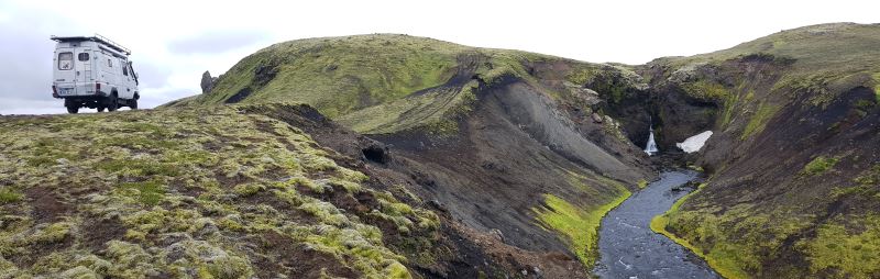Le début de la piste est roulant et agréable, praticable avec n’importe quel véhicule 4x4. Aucune difficulté. Après quelques kilomètres, nous décidons de passer la nuit sur le « parking » de la cascade de Axlafoos., à moins d’un kilomètre de la F210. Endroit super tranquille pour dormir