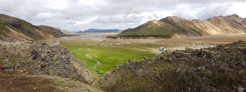Comme en 2015, Le « camping » de Landmannalaugar est bien rempli et cela malgré un tarif de la place exagéré. Il faut dire que le lieu est très prisé des randonneurs. Le matin, c’est le défilé des Bus qui amène encore plus de monde sur le site. Tout ce beau monde repartira en fin d’après midi après avoir effectué une des nombreuses balades possibles.