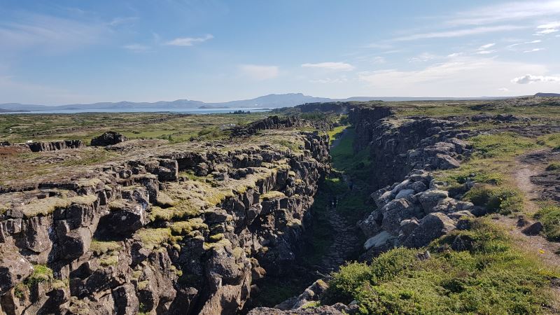En chemin, nous faisons un arrêt à la caldera de Kerið. Joli cratère avec un lac d’un bleu magique. Ca vaut le petit crochet, sauf que l’accès au site est maintenant payant. Nous continuons pour se rendre à la faille de Þingvellir. Nous choisissons de passer par la rive est du lac de Þingvallavatn. La route est plus longue en temps mais permet de découvrir de très jolis paysages. Nous faisons une petite visite de la faille, afin de se remémorer d’anciens souvenirs. Nous y étions passé en 2015, mais nous n’avions pas fait attention à ce trolls sur le haut de la faille.