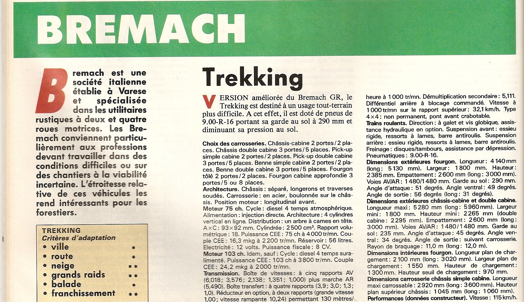 Bremach est un constructeur italien fondé à Brescia en 1980, spécialisé dans les véhicules tout-terrain utilitaires. Les Bremach sont plus rustiques et trapus que la plupart des autres 4x4 utilitaires, avec des dimensions légèrement plus compactes et un poids un peu plus léger, ce qui les rend maniables sur les terrains difficiles.