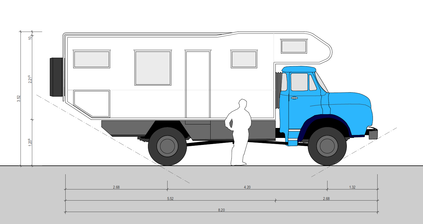 La cellule aura un grand lit à l'arrière avec rangements. On y accède par une banquette en U faisant la largeur du camion au centre de laquelle il y a la table à manger (grands vitrages carrés, façon train)