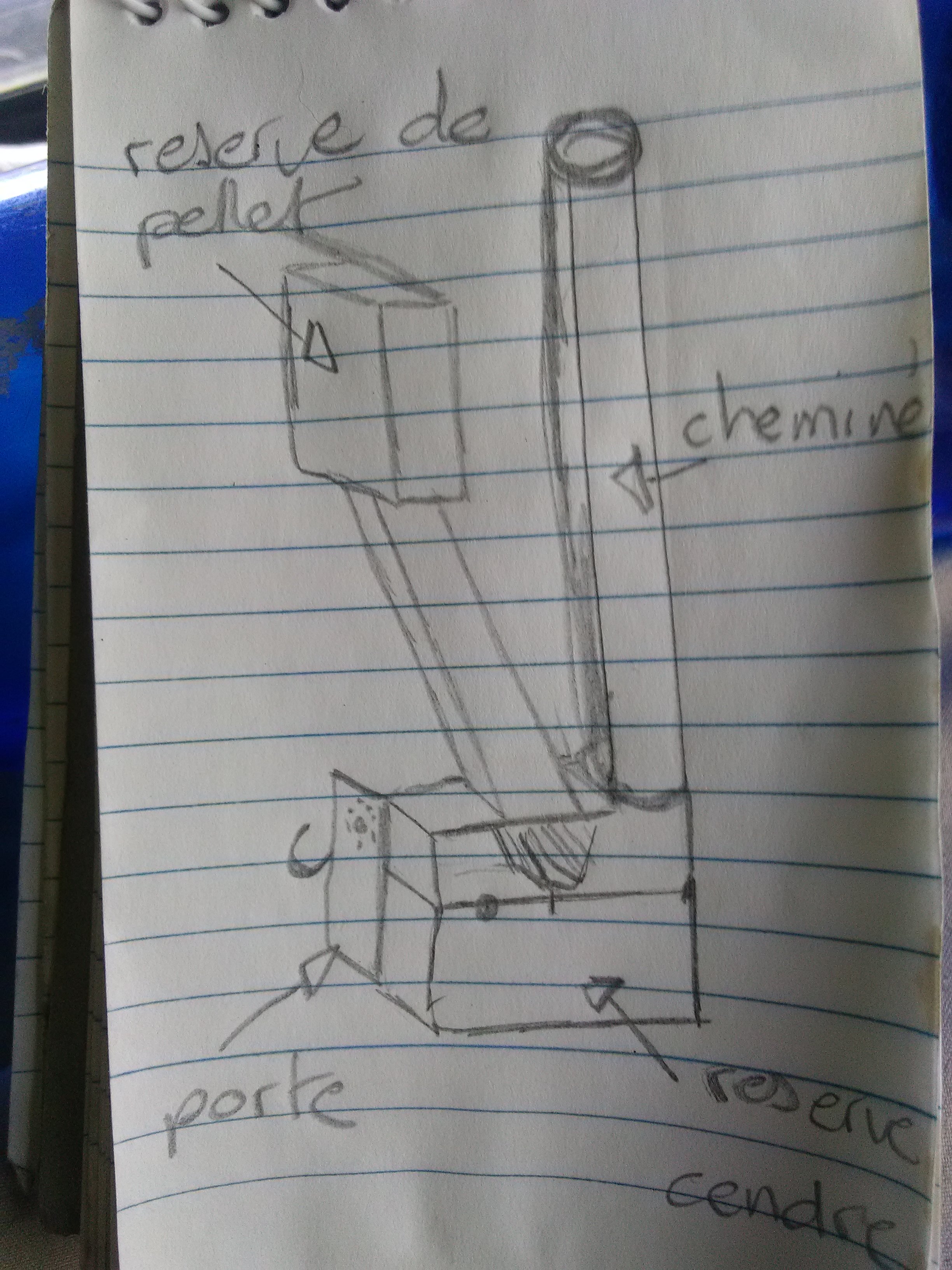 Alors voilà pour le principe, on met les granulés de bois dans le tube oblique/vertical, ils tombent dans le bruleur, ensuite par l'avant on allume avec un petit chalumeau style lampe a souder .