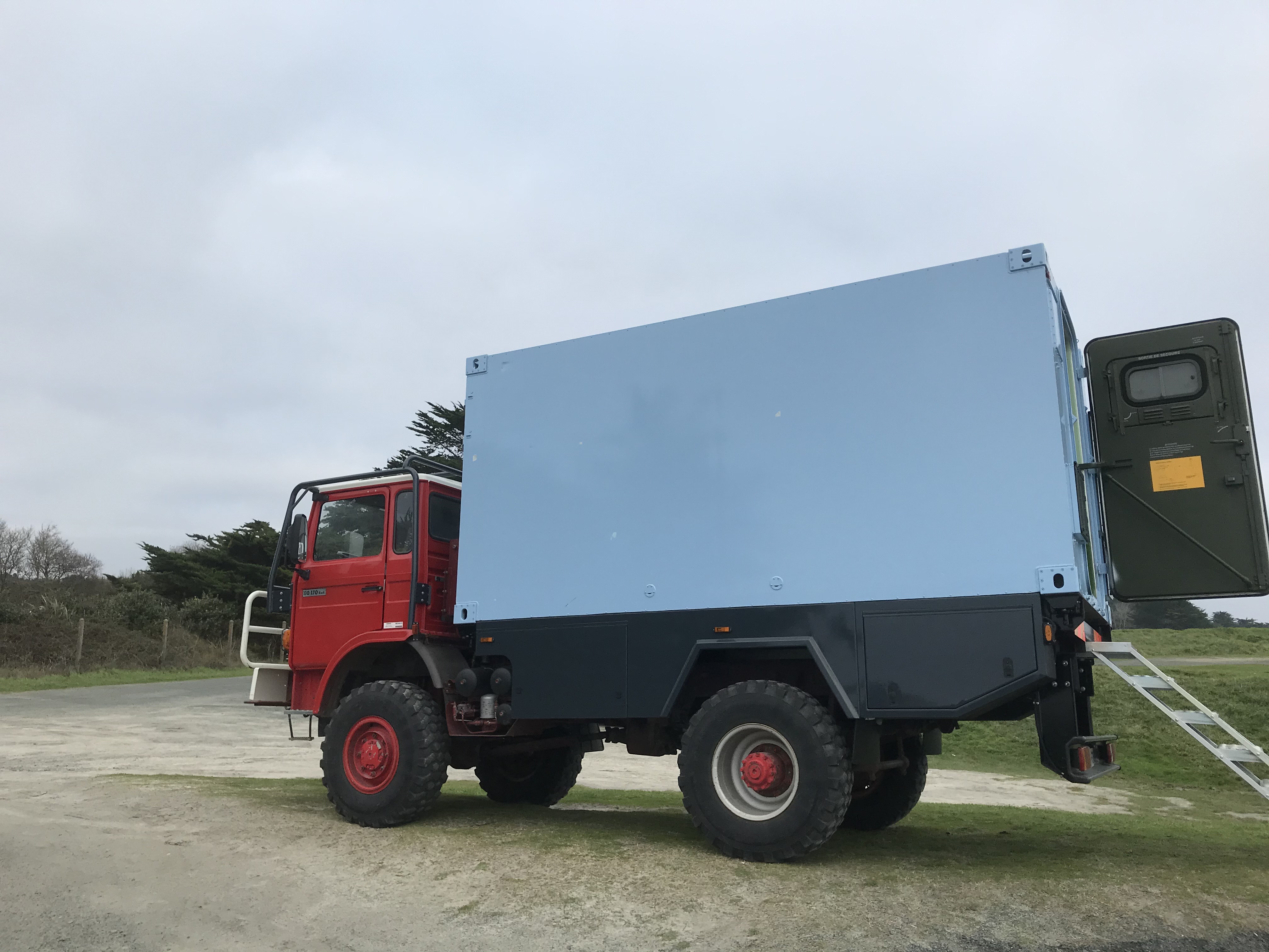 Le camion est de 1993 et à 30 000 km. Le shelter est fixé sur un faux châssis 3 points mais il peut être retiré.