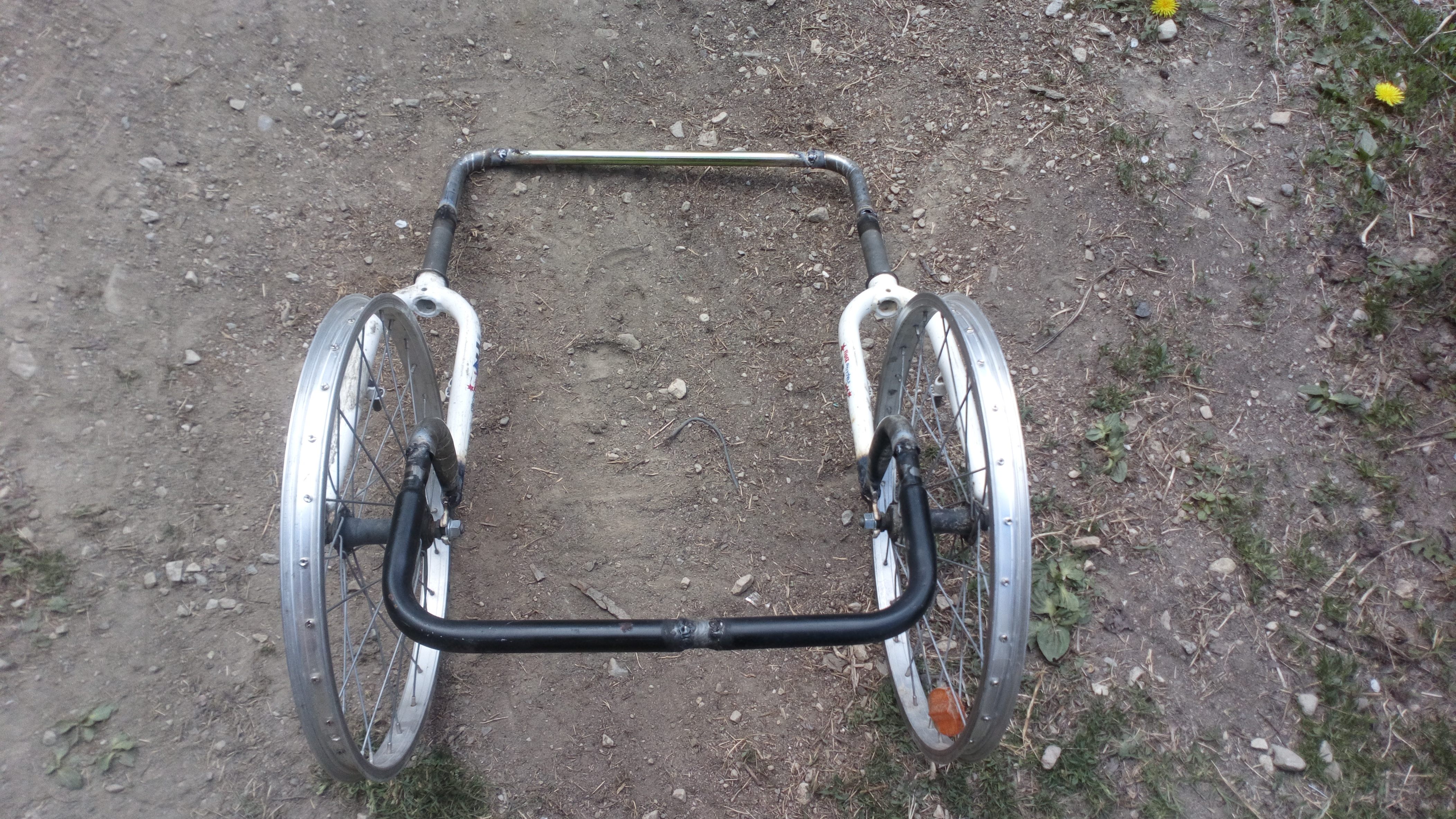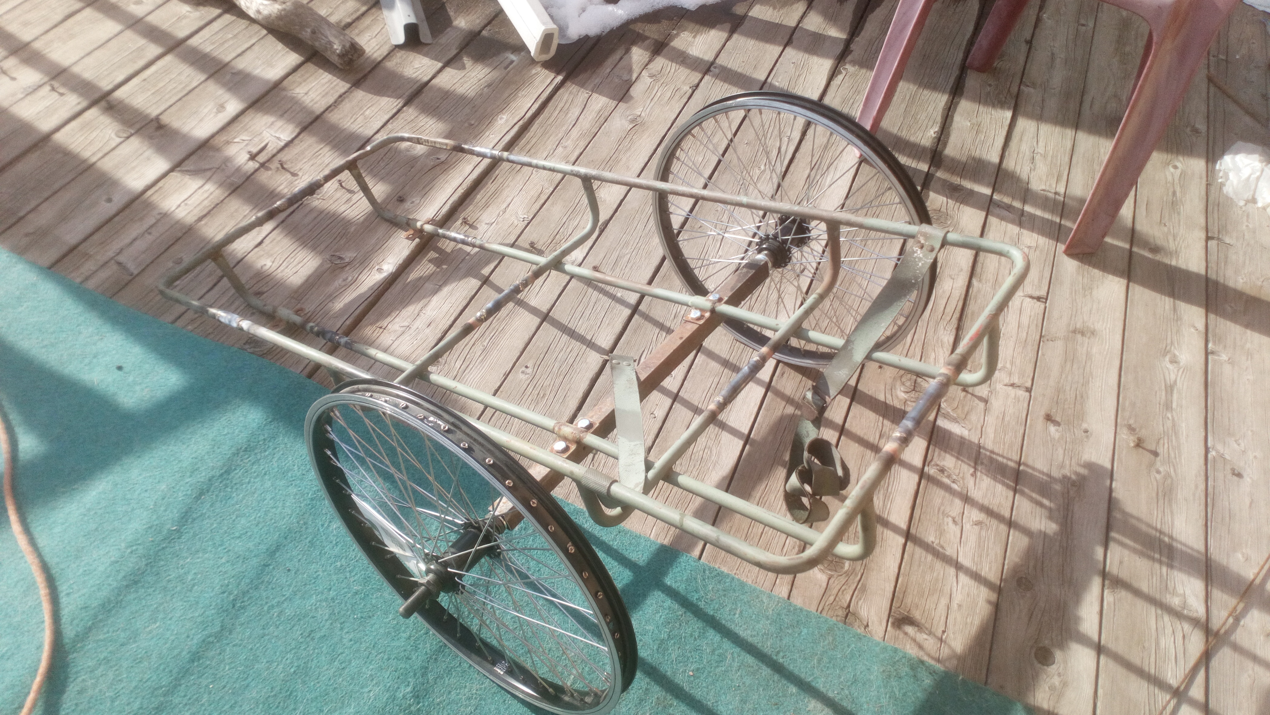C est la remorque pour le tricycle à madame, plus légère, prévu pour le transport des duvets des matelas du tart/tente, bâche de secours, sièges, truc leger