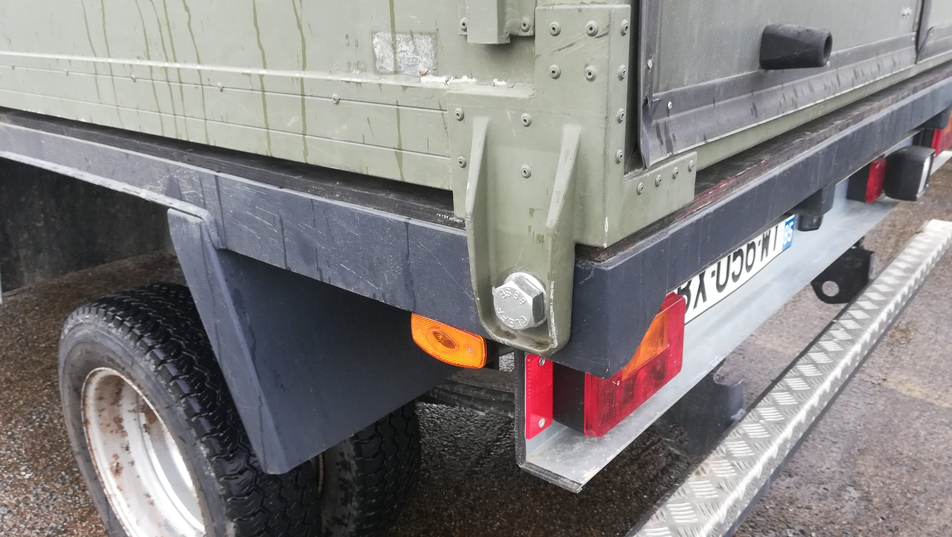 Marche pieds en place. On peut apercevoir que la malle a été remplacé par un support roue de secours