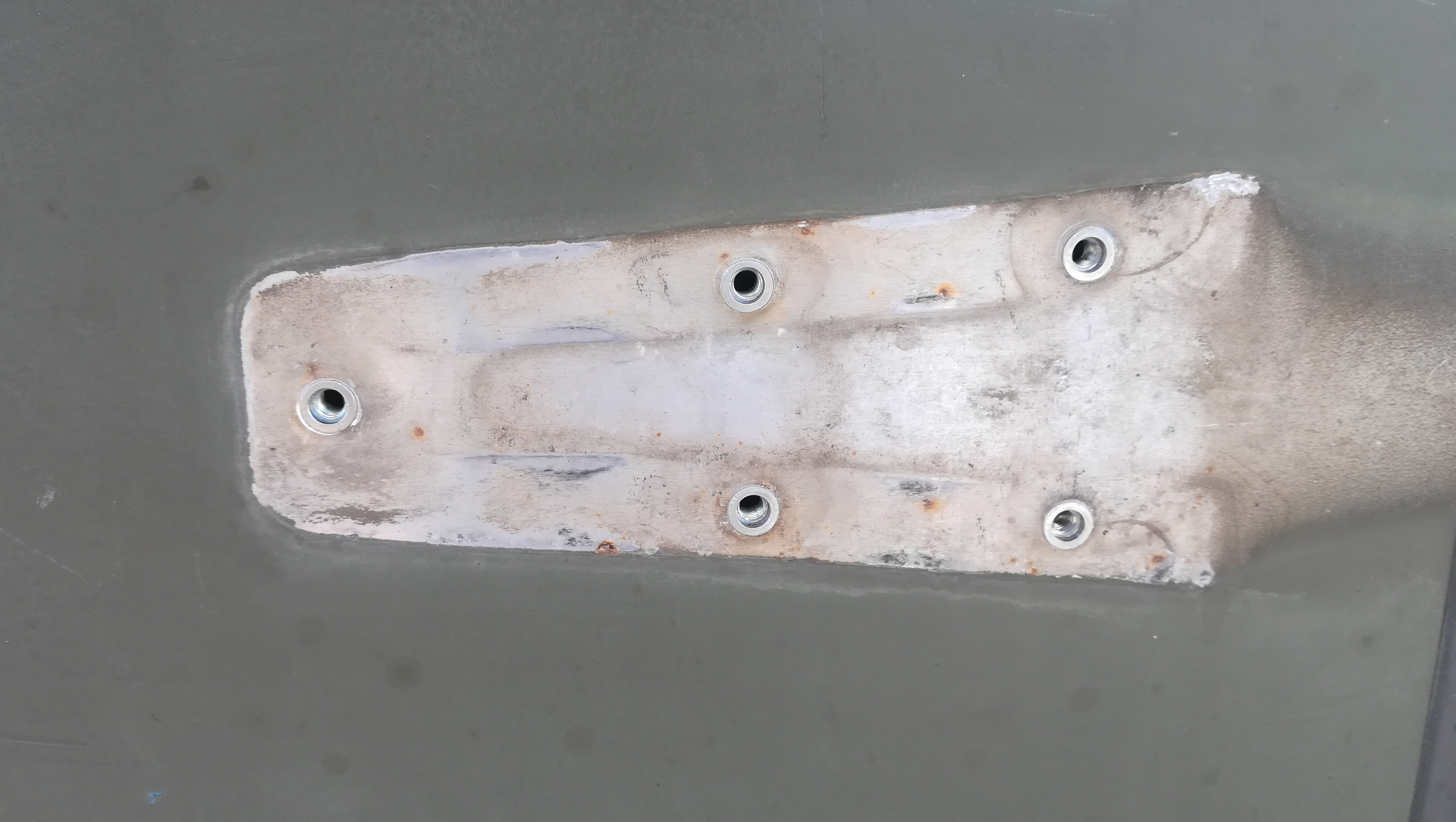 une réparation avait été effectué au niveau des charnières de la porte ... on enlève tout ça et on remplace par des inserts filtés avec de belles vis à têtes fraisées