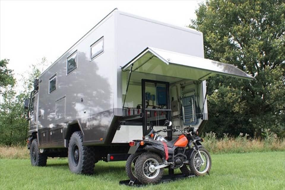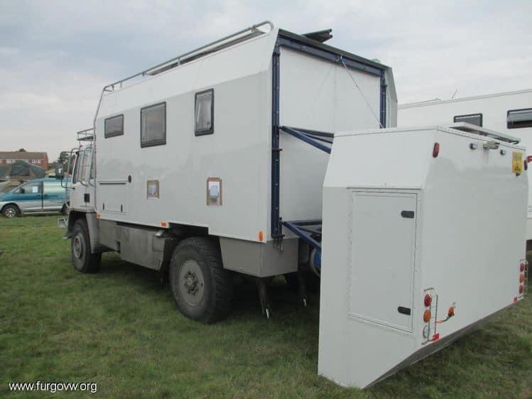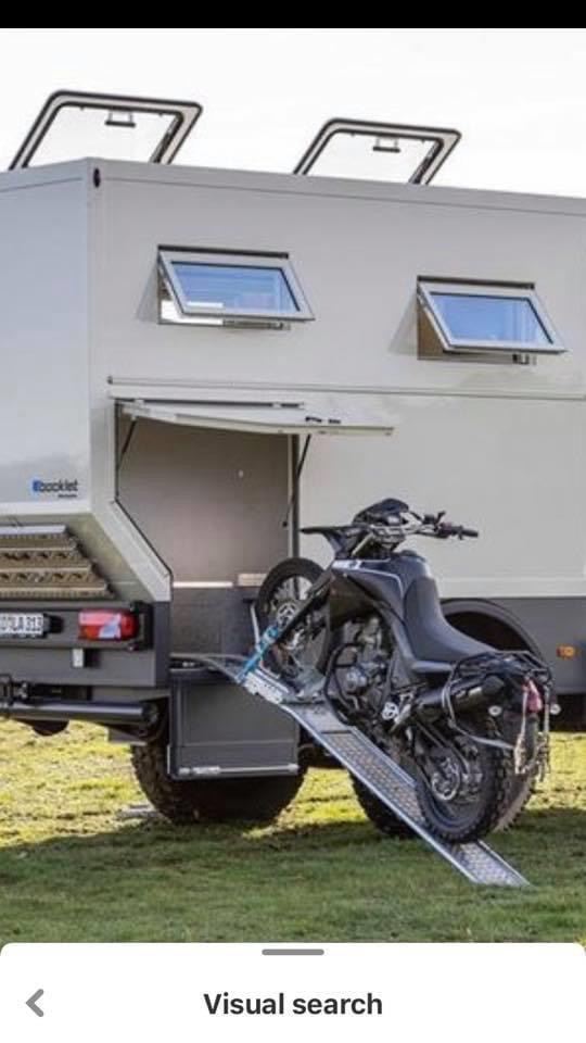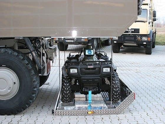 De tout les salon du Camper ou du camping car que j'ai pu faire, la seule option pour avoir un coffre capable de porter une petite voiture étaient sur le même principe... le châssis coupé derrière les mains de suspension et un faux châssis structurel (mais fixé en rigide) qui realise une cage pour s'affranchir de devoir avoir 2 rampes trop imposantes pour charger le véhicule.