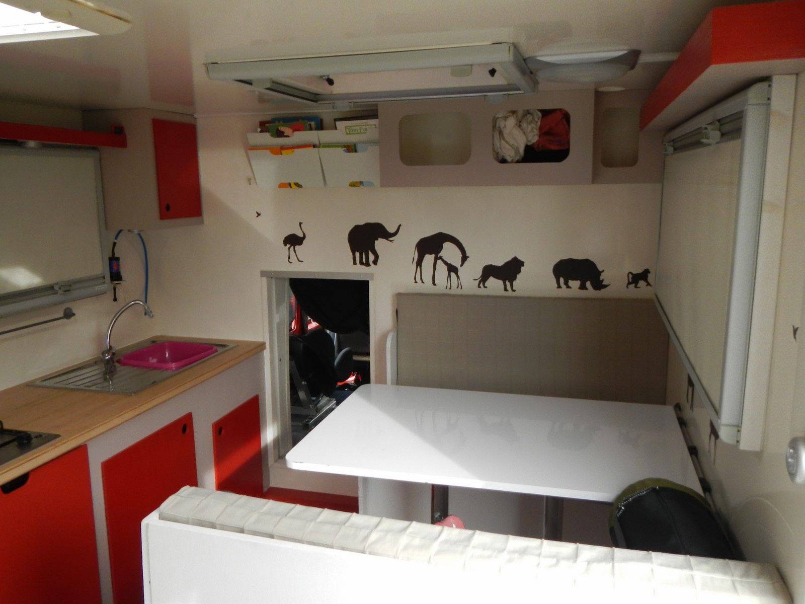 • L’aménagement intérieur est réalisé en panneau de contreplaqué marine de 18mm, collé et renforcé par des équerres.