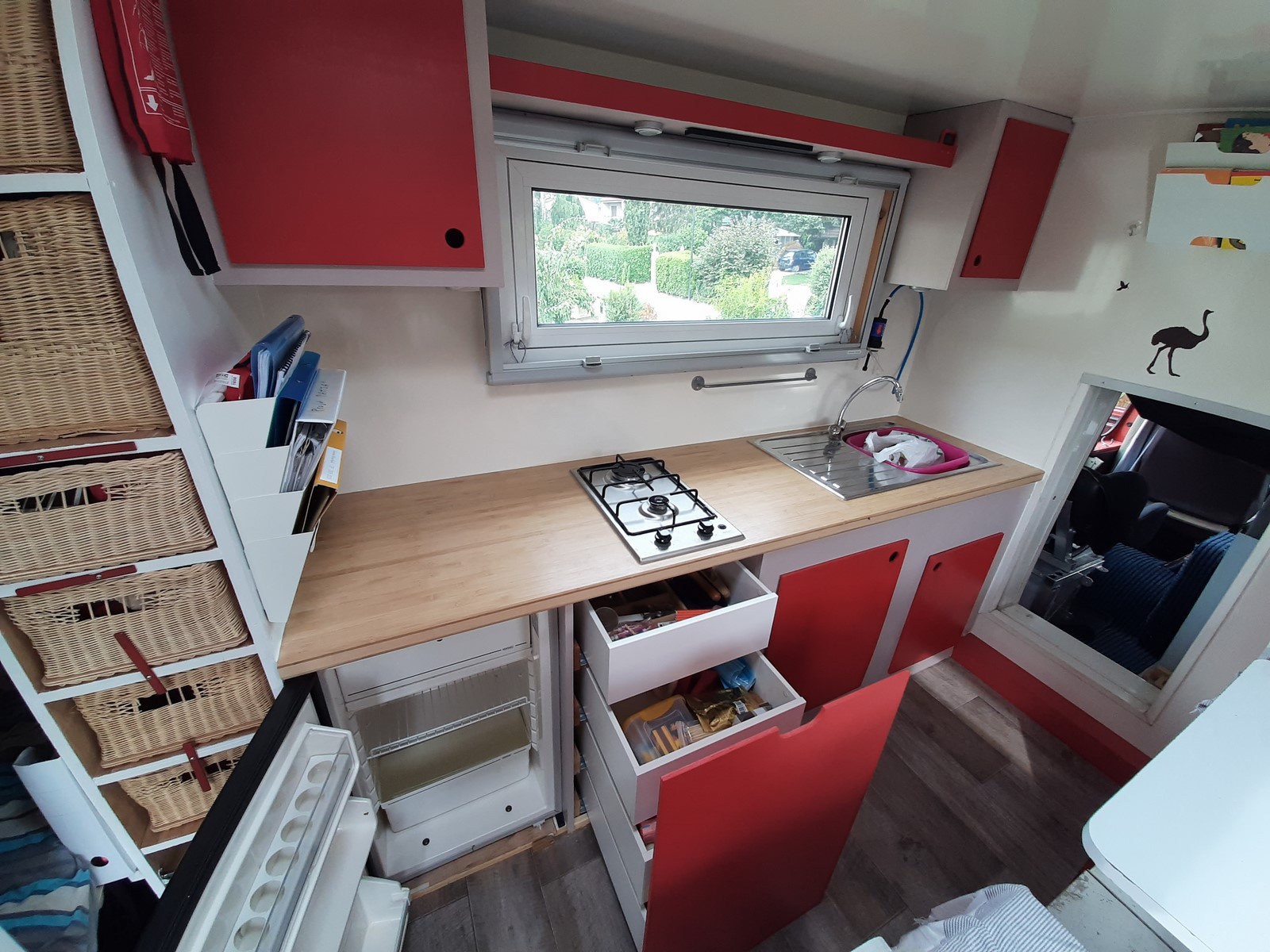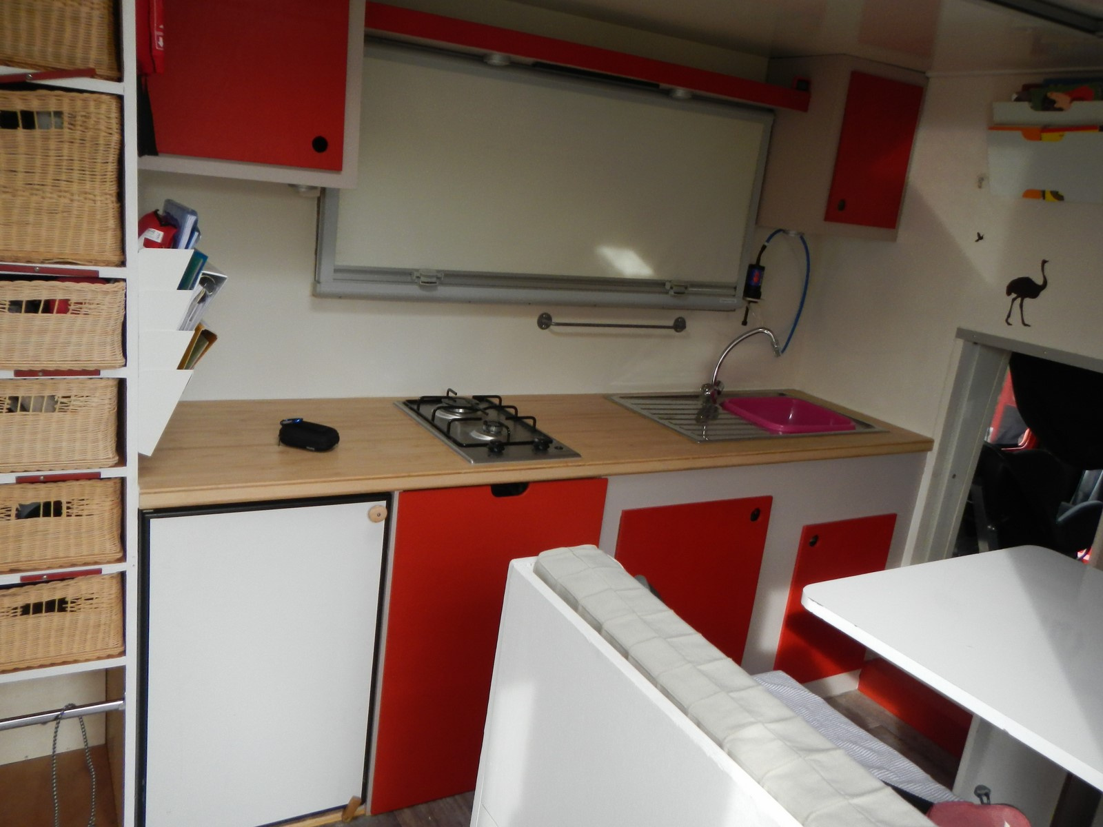• En termes de cuisine : une gazinière 2 feux, un évier, un frigo à compresseur 12v