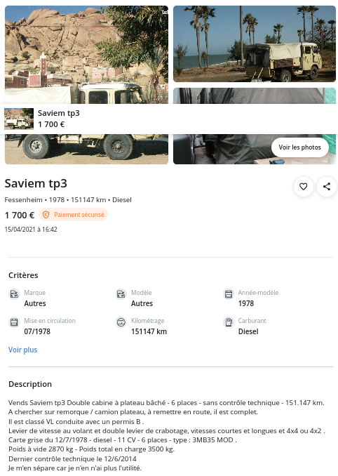 Un fourgon diesel avec 20 000km et un double-cabine que nous avions vu il y a longtemps lors d'une AG... Bruno doit bien se souvenir de la réparation du pot d'échappement