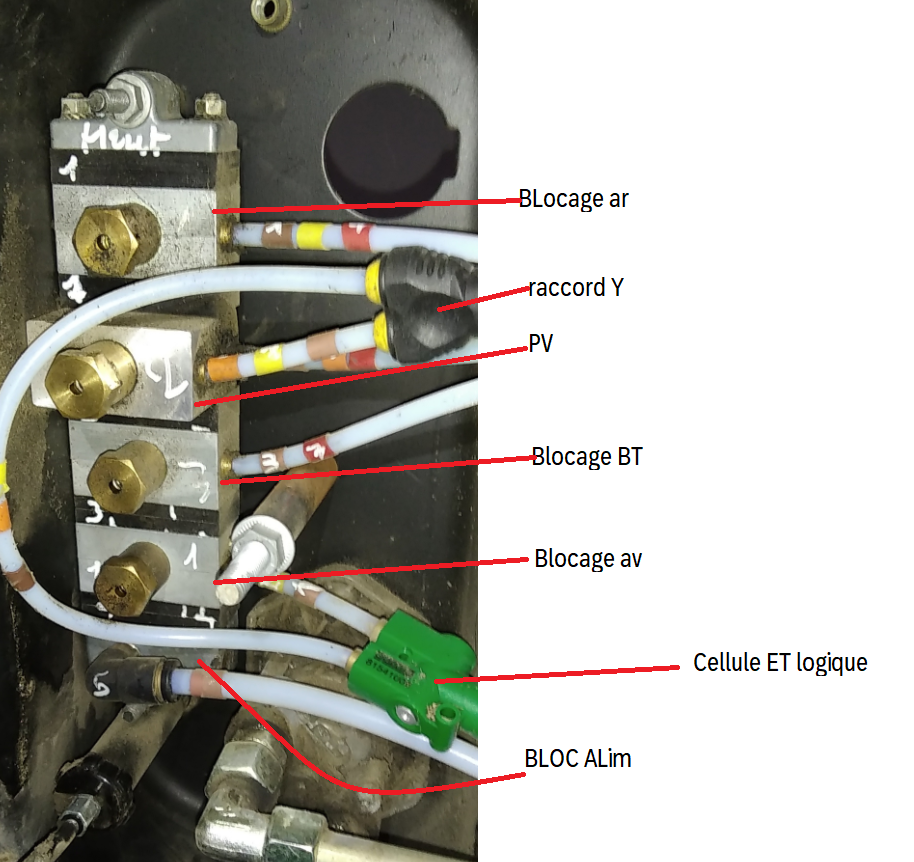 Le piquage Y permet donc d'apporter la pression sur 1 des arrivées de la cellule logique lorsque tu passe en PV. , puis que tu appuies sur la commande de blocage le pont avant, tu apportes la pression sur l'autre entrée de la cellule logique donc elle laisse passer la pression.