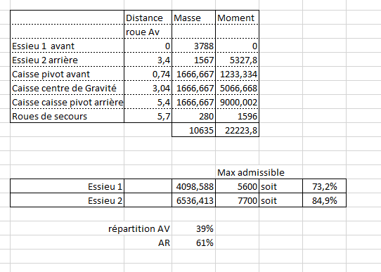 il y a une erreur donc avec le point central ou le centre de gravité de la caisse.. il faut que je retrouve la méthode pour modifier le calcul, mais dans l'ensemble cela ne changera pas la répartition des masse dans son ensemble de beaucoup. On parles de 150-200Kg de plus ou de moins dans les répartitions sur les essieux.